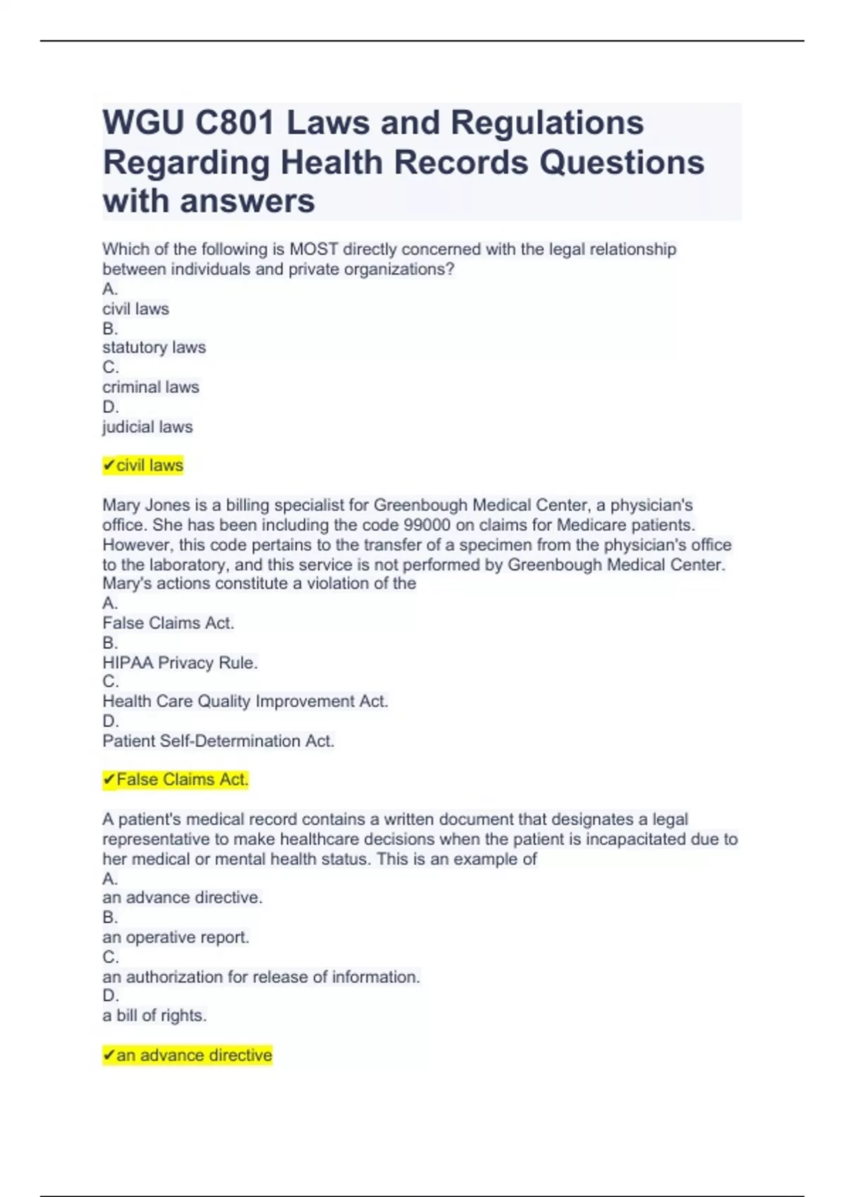 WGU C801 Laws and Regulations Regarding Health Records Questions with answers