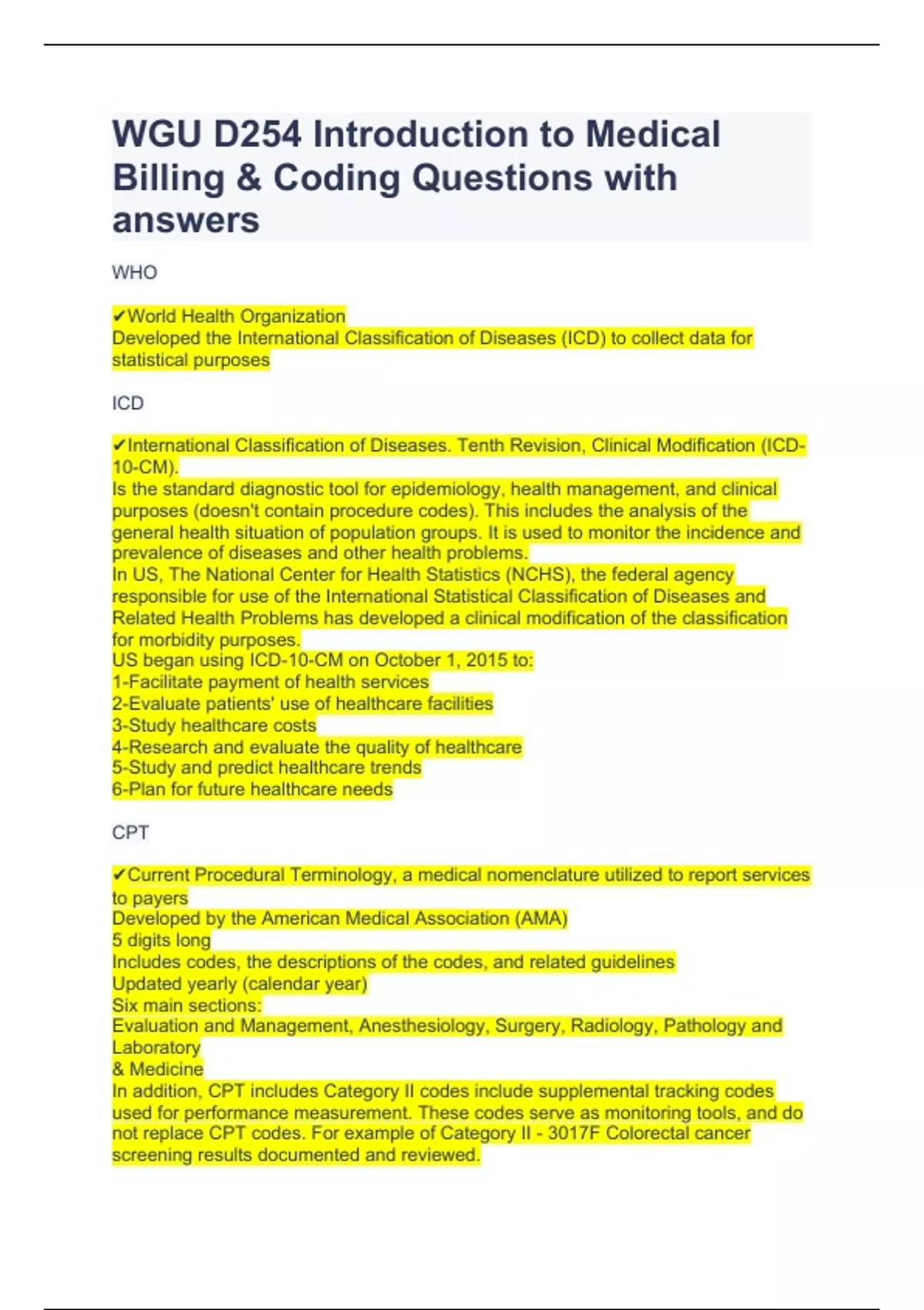 WGU D254 Introduction to Medical Billing & Coding Questions with answers