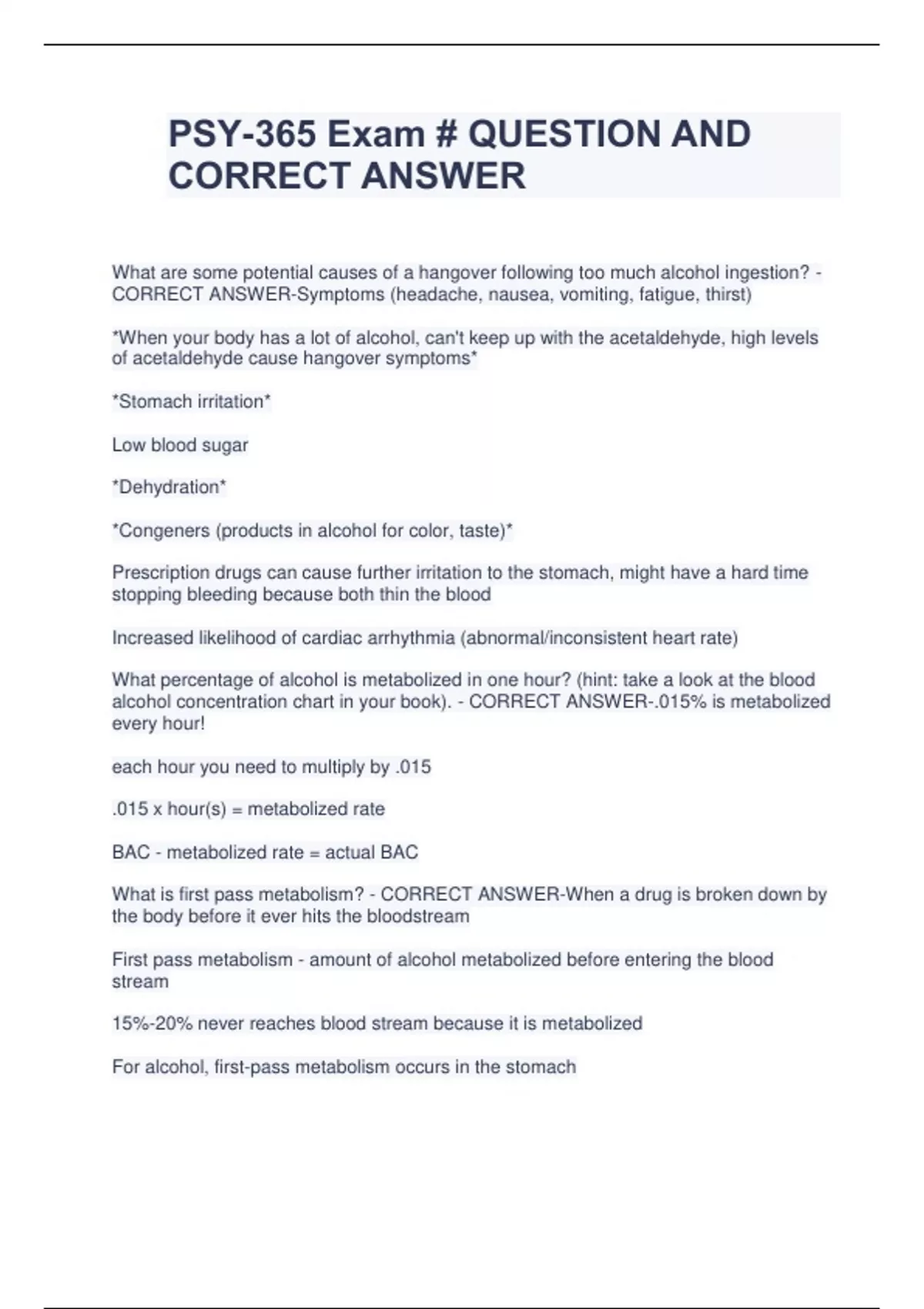 PSY-365 Exam # QUESTION AND CORRECT ANSWER What are some potential causes of a hangover following too much alcohol ingestion? - CORRECT ANSWER-Symptoms (headache, nausea, vomiting, fatigue, thirst) *When your body has a lot of alcohol, can't keep up with the acetaldehyde, high levels of acetaldehyde cause hangover symptoms* *Stomach irritation* Low blood sugar *Dehydration* *Congeners (products in alcohol for color, taste)* Prescription drugs can cause further irritation to the stomach, might have a hard time stopping bleeding because both thin the blood Increased likelihood of cardiac arrhythmia (abnormal/inconsistent heart rate) What percentage of alcohol is metabolized in one hour? (hint: take a look at the blood alcohol concentration chart in your book). - CORRECT ANSWER-.015% is metabolized every hour! each hour you need to multiply by .015 .015 x hour(s) = metabolized rate BAC - metabolized rate = actual BAC What is first pass metabolism? - CORRECT ANSWER-When a drug is broken down by the body before it ever hits the bloodstream First pass metabolism - amount of alcohol metabolized before entering the blood stream 15%-20% never reaches blood stream because it is metabolized For alcohol, first-pass metabolism occurs in the stomach Longer alcohol stays in stomach, more metabolization occurs How is first pass metabolism affected by drinking on an empty stomach? - CORRECT ANSWER-For alcohol, first-pass metabolism occurs in the stomach Longer alcohol stays in stomach, more metabolization occurs Empty stomach = content of stomach gets emptied quickly into small intestines Thus: when drinking on an empty stomach, alcohol doesn't sit in the stomach for a long time, quickly passed into small intestine where it gets absorbed into the bloodstream 15%-20% more alcohol gets absorbed With an empty stomach first pass metabolism is lowered and alcohol goes directly into blood stream First-pass metabolism gets bypassed, therefore you get more of what you drink into the blood stream On a full stomach = alcohol stays in stomach longer, more exposure to alcohol dehydrogenase, more gets metabolized, 15-20% never makes it to small intestine and gets broken down What is the primary mechanism of action in the brain for alcohol? - CORRECT ANSWER-Dual model = alcohol is going to facilitate (increase) inhibitory neurotransmitters, and decrease excitatory neurotransmitters Non-specific model of action = decreases neurotransmitter release all of the brain, resulting in central nervous system depression (thought to make membranes of the neurons swell up, tightening the membranes to the point where they can't release neurotransmitters) -------------------- A drugs such as alcohol blocks the release of glutamate causing the terminal buttons to swell by reducing the excitation of the brain Alcohol can pass through membranes and neurons in your brain, can lead to the swelling of the terminal buttons If they swell, it might reduce the number of transmitters being released from the terminal buttons Might suppress release of neurotransmitters and function as a central nervous system depressant Review the basics of the fermentation process. - CORRECT ANSWER-Converting sugars to alcohol using yeast The process of making wine, converting natural sugars into ethyl alcohol by the action of yeasts Natural sugars = honey, berries, corn, rye, apple, rice, etc. When it's all mixed together, the yeast consumes (breaks down) the sugar Every molecule of sugar that gets consumed turns into two molecules of alcohol and one carbon dioxide molecule As the yeast consumes the sugar, produces a fermented product with 12-14% alcohol Doesn't get stronger because once the alcohol gets concentrated enough, it kills the yeast No more yeast = no more fermentation Review the basics of the distillation process. - CORRECT ANSWER-The process of making liquor, by boiling a fermented liquid then cooling it, to produce a higher alcohol content Alcohol has a lower boiling point than water Alcohol will boil but not the water, forms steam/mist, travels through tube and cools, turns into liquid on the other side Basically removing water from the alcohol, creating a highly concentrated product Wind up with a very concentrated level of alcohol because all of the water is left behind What is the drug Antabuse used for and how does it work? - CORRECT ANSWERInhibits (blocks) acetaldehyde dehydrogenase enzyme If taken, not going to be able to metabolize acetaldehyde into acetic acid very efficiently So acetaldehyde build up in the body = makes them sick, red, nauseous, hot after drinking Theory = make the person think drinking is not good because of side effects Supposed to be a deterrent Not the case! Works for some people, doesn't work for others People that are prescribed this often do not take it Can't use other products that contain alcohol (mouth wash, cough medicine, etc.) What effects does alcohol have on the kidneys and what is antidiuretic hormone? - CORRECT ANSWER-Antidiuretic hormone = produced in hypothalamus and released by the pituitary glands, helps keep water in the body Has effects on the kidneys Alcohol blocks the antidiuretic hormone, making kidneys release more water Alcohol increases urination, water gets flushed out Antidiuretic hormone is produced by hypothalamus and released by pituitary gland, it tells the kidneys how much water to conserve, alcohol blocks this hormone Increases blood pressure Swollen fingers and limbs What effect does alcohol have on body temperature? - CORRECT ANSWER-MYTH: alcohol warms you up in a cold environment... not true! Alcohol makes blood vessels bigger and closer to the skin Since it is closer to skin, blood gets cooled down more than when it is not close to the skin Increased heat loss in cold weather, cools body temperature When people are in a cold environment, the body tends to lose heat when drinking because it dilates blood vessels in the body How do you calculate how much alcohol is in a particular