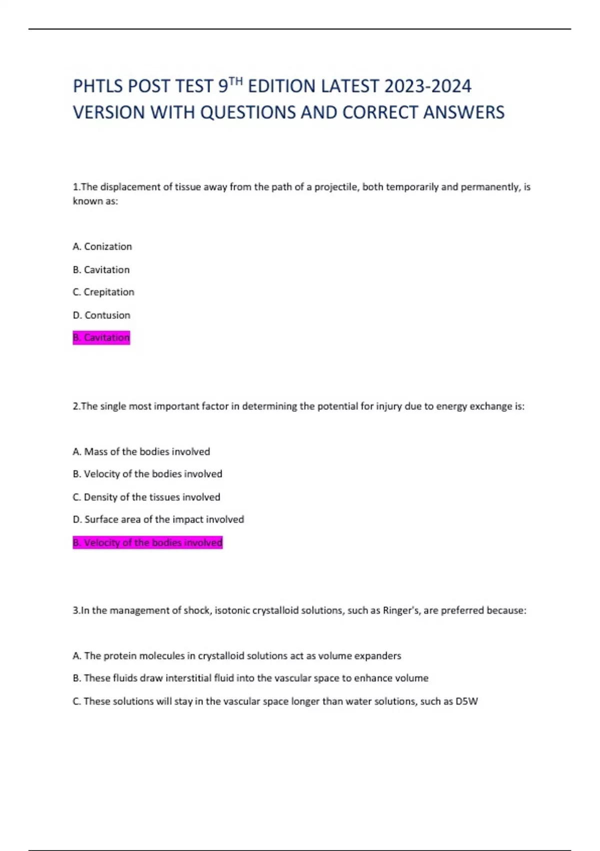 PHTLS POST TEST 9TH EDITION LATEST VERSION WITH QUESTIONS AND CORRECT ANSWERS