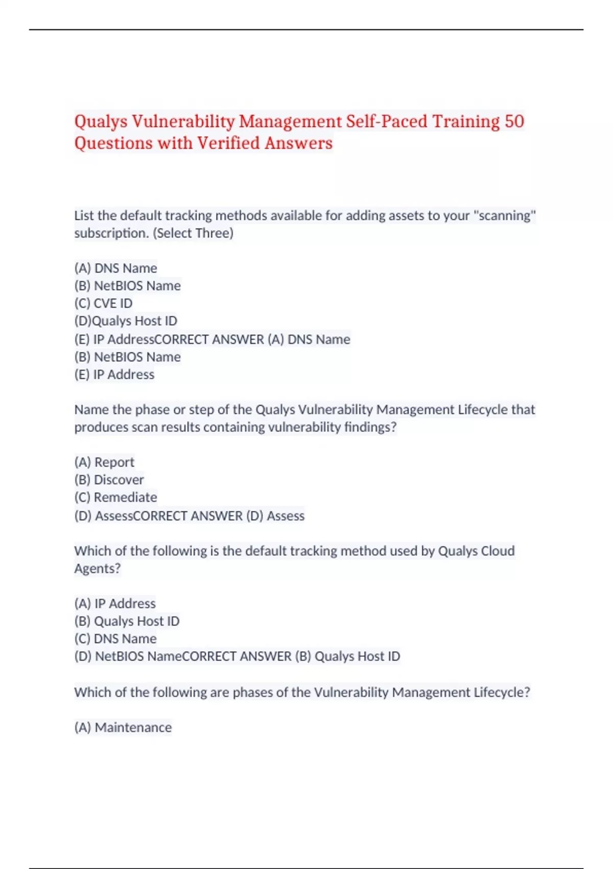 Qualys Vulnerability Management Self-Paced Training 50 Questions with Verified Answers List the default tracking methods available for adding assets to your "scanning" subscription. (Select Three) (A) DNS Name (B) NetBIOS Name (C) CVE ID (D)Qualys Host ID (E) IP AddressCORRECT ANSWER (A) DNS Name (B) NetBIOS Name (E) IP Address Name the phase or step of the Qualys Vulnerability Management Lifecycle that produces scan results containing vulnerability findings? (A) Report (B) Discover (C) Remediate (D) AssessCORRECT ANSWER (D) Assess Which of the following is the default tracking method used by Qualys Cloud Agents? (A) IP Address (B) Qualys Host ID (C) DNS Name (D) NetBIOS NameCORRECT ANSWER (B) Qualys Host ID Which of the following are phases of the Vulnerability Management Lifecycle? (A) Maintenance (B) Remediate (C) Design (D) Discover (E) ReportCORRECT ANSWER (B) Remediate (D) Discover (E) Report Name the type of scanner appliance (by default) available to all Qualys users with "scanning" privileges? (A) External (Internet-based) Scanner (B) Offline Scanner (C) Virtual Scanner (D) Internal ScannerCORRECT ANSWER (A) External (Internet-based) Scanner Only the _________ user role can edit QIDs in your account KnowledgeBase. (A) Manager (B) Administrator (C) Scanner (D) Unit ManagerCORRECT ANSWER (A) Manager Potential vulnerabilities are automatically verified. (True/ False) (A) True (B) FalseCORRECT ANSWER (B) False A severity ____________ vulnerability is the most urgent. (A) Level 5 (B) Level 1 (C) Level 2 (D) Level 4CORRECT ANSWER (A) Level 5 Which of the following criteria can be used to create a dynamic Search List? (Select Three). (A) Host Name (B) Severity Level (C) IP Address (D) CVE ID (E) CVSS ScoreCORRECT ANSWER (B) Severity Level (D) CVE ID (E) CVSS Score What is the name given to a custom list of QIDs taken from the Qualys KnowledgeBase? (A) Search List (B) Host Assets (C) Asset Group (D) Authentication RecordCORRECT ANSWER (A) Search List You have just created a Search List. Where can you use or apply it? (Select Three) (A) Report Template (B) Remediation Policy (C) Asset Group (D) Business Unit (E) Asset Tag (F) Option ProfileCORRECT ANSWER (A) Report Template (B) Remediation Policy (F) Option Profile A static Search List is created and updated ____________. (A) Manually (B) Explicit (C) By Default (D) AutomaticallyCORRECT ANSWER (A) Manually What are the primary methods available in Qualys VM, for grouping, labeling, and organizing host assets? (Select Two) (A) Severity Levels (B) Search Lists (C) Asset Groups (D) Asset TagsCORRECT ANSWER (C) Asset Groups (D) Asset Tags Which of the following options can be used to add assets to an Asset Group? (Select Three) (A) DNS name (B) MAC address (C) IP address (D) NetBIOS nameCORRECT ANSWER (A) DNS name (C) IP address (D) NetBIOS name Scans must be performed in "________________" mode to produce a list of installed software applications. (A) Authorized (B) Administrative (C) Temporary (D) AuthenticatedCORRECT ANSWER (D) Authenticated Why is it beneficial to configure the Business Impact of an Asset Group? (A) It's used to calculate Business Risk (B) It's used to calculate storage space (C) It's used to calculate Severity Levels (D) It's used to calculate CVSS ScoresCORRECT ANSWER (A) It's used to calculate Business Risk A "static" Asset Tag will adjust dynamically and automatically to changes made to your host assets. (True/False) (A) True (B) FalseCORRECT ANSWER (B) False The service creates some initial asset tags based on the existing objects (configurations) in your account. List those asset tags. (Select Four) (A) Asset Groups (B) Business Units (C) Malware Domaine Assets (D) Web Application Assets (E) Software InstalledCORRECT ANSWER (A) Asset Groups (B) Business Units (C) Malware Domaine Assets (D) Web Application Assets Which of the following is NOT a benefit or characteristic of Asset Tags? (A) Dynamically updated (B) Hierarchical organization (support nesting) (C) Helps to automate scanning and reporting tasks (D) Identifies the "Business Impact" of host assetsCORRECT ANSWER (D) Identifies the "Business Impact" of host assets A filtering device can impact the _______ ability to assess a host for vulnerabilities. (A) Scanner's (B) Agent's (C) Connector's (D) API'sCORRECT ANSWER (A) Scanner's Qualys Cloud Agent is installed as a local system service on each host as ___________ agent/agents per host. (A) Multiple (B) Zero (C) One (D) TwinCORRECT ANSWER (C) One You are building an Options Profile that targets "Zero Day" vulnerabilities. Which "Scan" option will allow you to use a "Zero Day" Search List to achieve this objective? (A) Password Brute Forcing (B) Additional Certificate Detection (C) Vulnerability Detection (D) TCP PortsCORRECT ANSWER (C) Vulnerability Detection Agents and Scanners can be combined to cater to the vulnerability assessment needs. (A) Correct (B) IncorrectCORRECT ANSWER (A) Correct The primary modules that collect the host configuration data are: (Select Four) (A) Porting Scanning (B) Operating System Detection (C) Service Detection (D) Network Scanning (E) Host DiscoveryCORRECT ANSWER (A) Porting Scanning (B) Operating System Detection (C) Service Detection (E) Host Discovery Which of the following sensors are presently used by Qualys VM to collect the data needed to perform host vulnerability assessments? (Select Two) (A) Cloud Connector (B) Scanner Appliance (C) Cloud Agent (D) Passive SensorCORRECT ANSWER (B) Scanner Appliance (C) Cloud Agent One of your "Scanner" users would like to perform a comprehensive scan (occasionally) that targets the maximum number of service ports. Which port scanning option do you recommend? (A) None (B) Standard Scan (C) Light Scan (D) FullCORRECT ANSWER (D) Full Which module does a Qualys Scanner Appliance load to determine the LIVE/DEAD status of targeted hosts? (A) Service Detection (B) OS Detection (C) Host Discovery (D) Port ScanningCORRECT ANSWER (C) Host Disc