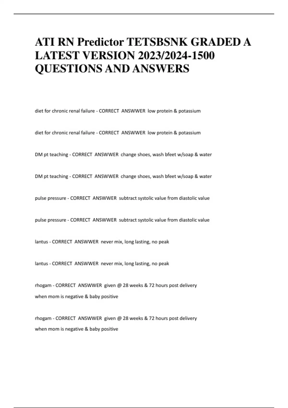ATI RN Predictor TETSBSNK GRADED A LATEST VERSION 2023/ QUESTIONS AND ANSWERS diet for chronic renal failure - CORRECT ANSWWER low protein & potassium diet for chronic renal failure - CORRECT ANSWWER low protein & potassium DM pt teaching - CORRECT ANSWWER change shoes, wash bfeet w/soap & water DM pt teaching - CORRECT ANSWWER change shoes, wash bfeet w/soap & water pulse pressure - CORRECT ANSWWER subtract systolic value from diastolic value pulse pressure - CORRECT ANSWWER subtract systolic value from diastolic value lantus - CORRECT ANSWWER never mix, long lasting, no peak lantus - CORRECT ANSWWER never mix, long lasting, no peak rhogam - CORRECT ANSWWER given @ 28 weeks & 72 hours post delivery when mom is negative & baby positive rhogam - CORRECT ANSWWER given @ 28 weeks & 72 hours post delivery when mom is negative & baby positive indication of baby dehydration improving - CORRECT ANSWWER smooth fontannel indication of baby dehydration improving - CORRECT ANSWWER smooth fontannel pt w/orthostatic hypotension - CORRECT ANSWWER put near nursing station pt w/orthostatic hypotension - CORRECT ANSWWER put near nursing station cleaning a wound - CORRECT ANSWWER clean to dirty use bulb syringe cleaning a wound - CORRECT ANSWWER clean to dirty use bulb syringe peripheral arterial disease - CORRECT ANSWWER cramp in leg while walking intermitment claudication peripheral arterial disease - CORRECT ANSWWER cramp in leg while walking intermitment claudication seizure precautions - CORRECT ANSWWER supine position seizure precautions - CORRECT ANSWWER supine position 20 weeks gestation, having urinary frequency - CORRECT ANSWWER u/a & c/s 20 weeks gestation, having urinary frequency - CORRECT ANSWWER u/a & c/s report to new nurse @ shift change - CORRECT ANSWWER pt @ xray report to new nurse @ shift change - CORRECT ANSWWER pt @ xray s/s of hemolytic blood transfusion - CORRECT ANSWWER flank pain s/s of hemolytic blood transfusion - CORRECT