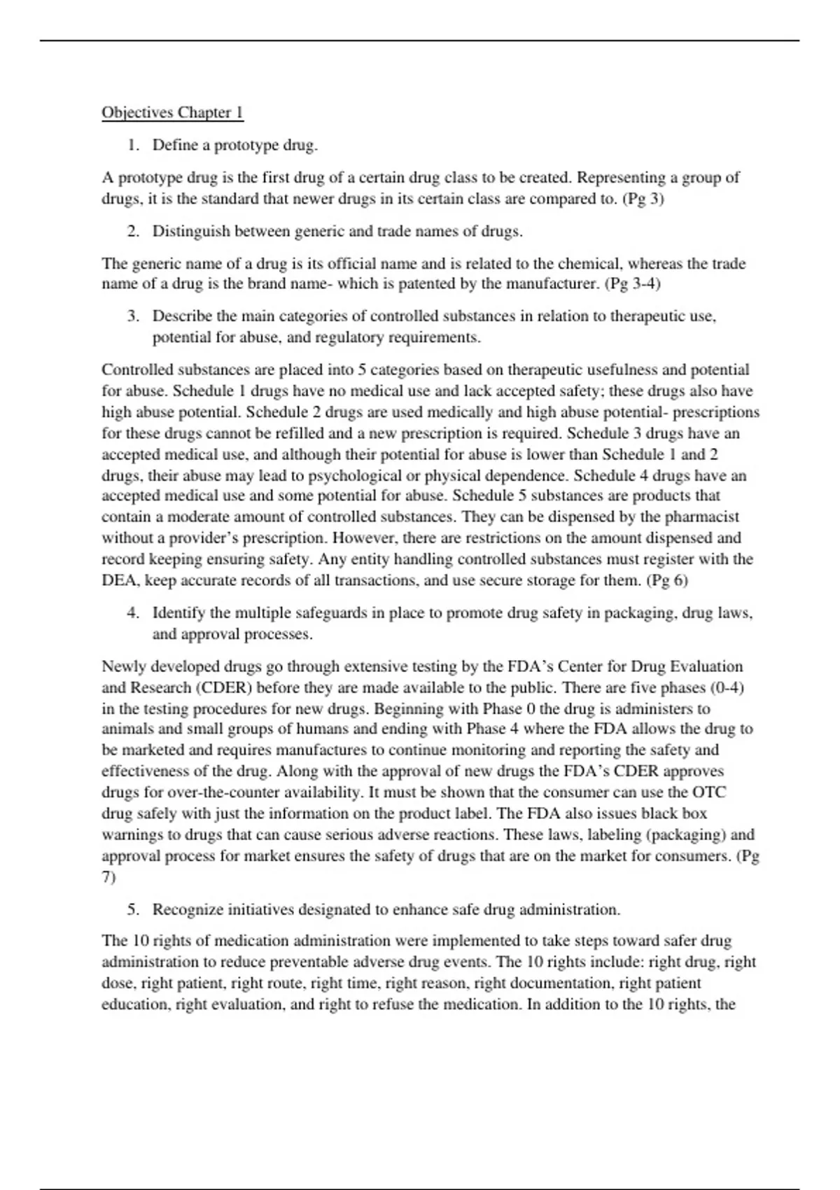 Objectives Chapter 1 1. Define a prototype drug. A prototype drug is the first drug of a certain drug class to be created. Representing a group of drugs, it is the standard that newer drugs in its certain class are compared to. (Pg 3) 2. Distinguish between generic and trade names of drugs. The generic name of a drug is its official name and is related to the chemical, whereas the trade name of a drug is the brand name - which is patented by the manufacturer. (Pg 3 -4) 3. Describe the main categories of controlled substances in relation to therapeutic use, potential for abuse, and regulatory requirements. Controlled substances are placed into 5 categories based on therapeutic usefulness and potential for abuse. Schedule 1 drugs have no medical use and l ack accepted safety; these drugs also have high abuse potential. S chedule 2 drugs are used medically and high abuse potential - prescriptions for these drugs cannot be refilled and a new prescription is required. Schedule 3 drugs have an accepted medical use, and although their potential for abuse is lower than Schedule 1 and 2 drugs, their abuse may lead to psychological or physical dependence. Schedule 4 drugs have an accepted me dical use and some potential for abuse. Schedule 5 substances are products that contain a moderate amount of controlled substances . They can be dispensed by the pharmacist without a provider’s prescription . However , there are restrictions on the amount dispensed and record keeping ensuring safety. Any entity handling controlled substances must register with the DEA, keep accurate records of all transactions, and use secure storage for them. (Pg 6) 4. Identify the multiple safeguards in place to promote drug safety in packaging, drug laws, and approval processes. Newly developed drugs go through extensive testing by the FDA’s Center for Drug Evaluation and Research (CDER) before they are made available to the public. There are five phases (0 -4) in the testing procedures for new drugs. Beginning with Phase 0 the drug is administers to animals and small groups of humans and ending with Phase 4 where the FDA allows the drug to be marketed and requires manufactures to continue monitoring and reporting the safety and effectiveness of the drug. Along with the approval of new drugs the FDA’s CDER approves drugs for over-the-counter availability. It must be shown that the consumer can use the OTC drug safely with just the information on the product label . The FDA also issues black box warnings to drugs that can cause serious adverse reactions. These laws, labeling (packaging) and approval process for market ensures the safety of drugs that are on the market for consumers. (Pg 7) 5. Recognize initiatives designated to enhance safe drug administration. The 10 rights of medication administration were implemented to take steps toward safer drug administration to reduce preventable adverse drug events. The 10 rights include: right drug, right dose, right patient, right route, right time, right reason, right documentation, right patient education, right evaluation, and right to refuse the medication. In addition to the 10 rights, the