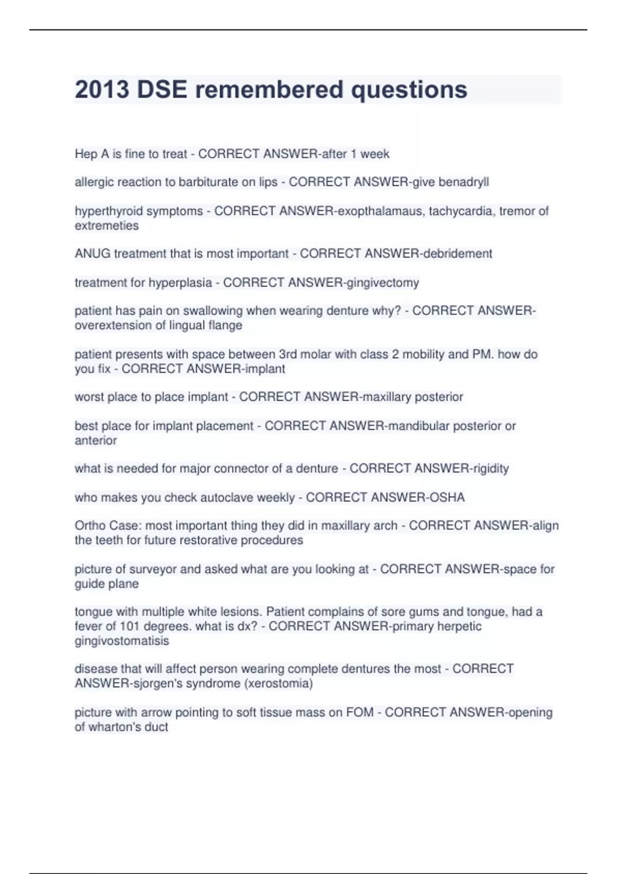 2013 DSE remembered questions Hep A is fine to treat - CORRECT ANSWER-after 1 week allergic reaction to barbiturate on lips - CORRECT ANSWER-give benadryll hyperthyroid symptoms - CORRECT ANSWER-exopthalamaus, tachycardia, tremor of extremeties ANUG treatment that is most important - CORRECT ANSWER-debridement treatment for hyperplasia - CORRECT ANSWER-gingivectomy patient has pain on swallowing when wearing denture why? - CORRECT ANSWERoverextension of lingual flange patient presents with space between 3rd molar with class 2 mobility and PM. how do you fix - CORRECT ANSWER-implant worst place to place implant - CORRECT ANSWER-maxillary posterior best place for implant placement - CORRECT ANSWER-mandibular posterior or anterior what is needed for major connector of a denture - CORRECT ANSWER-rigidity who makes you check autoclave weekly - CORRECT ANSWER-OSHA Ortho Case: most important thing they did in maxillary arch - CORRECT ANSWER-align the teeth for future restorative procedures picture of surveyor and asked what are you looking at - CORRECT ANSWER-space for guide plane tongue with multiple white lesions. Patient complains of sore gums and tongue, had a fever of 101 degrees. what is dx? - CORRECT ANSWER-primary herpetic gingivostomatisis disease that will affect person wearing complete dentures the most - CORRECT ANSWER-sjorgen's syndrome (xerostomia) picture with arrow pointing to soft tissue mass on FOM - CORRECT ANSWER-opening of wharton's duct Pan with radiopacities underneath mandibular incisors. Dx - CORRECT ANSWERsupernumerary teeth gingival edema caused by - CORRECT ANSWER-anaerobes post crown cementation sensitivity due to - CORRECT ANSWER-microleakage before you reline a complete denture one must first do what - CORRECT ANSWERestablish posterior occlusion picture of patients maxilla with FPD and RPD attached. how? - CORRECT ANSWERsemi precision attachments precision attachments not good for patients with - CORRECT ANSWER-low dexterity what do you want to know about patient on steroids - CORRECT ANSWER-duration and dosage before dental treatment patient just had stroke. what do you need to worry about - CORRECT ANSWER-if they are on anticoagulants contraindication for apically positioned flap - CORRECT ANSWER-esthetics purpose of wedge during restorative - CORRECT ANSWER-adaptation of matrix band hereditary telegnastia is associated with - CORRECT ANSWER-Fe(iron) deficiency high white blood cells, sore lymph nodes and painful gums indicate - CORRECT ANSWER-leukemia patient on penicillin for 2 weeks. tongue is sore. what test do yo do? - CORRECT ANSWER-fungal test what portions of mixed lesion do you biopsy - CORRECT ANSWER-red and white portions difference in anaphylaxis vs. syncope - CORRECT ANSWER-anaphylaxis has wheezing and bronchoconstriction extraction of tooth and patient returns with big infection - CORRECT ANSWERsubperiosteal abscess patient with down syndrome what should you be worried about as a dentist - CORRECT ANSWER-congenital heart defects (CHD) broken coronal portion of canine what do you do? - CORRECT ANSWER-conservative endo and prepare post and core T/F: acid etching does not create chemical bond - CORRECT ANSWER-true after cleaning and still BOP - CORRECT ANSWER-retained sub gingival plaque swollen lesion on tongue what do you do next - CORRECT ANSWER-palapate lesion to see if its firm bone loss on #4 - CORRECT ANSWER-crater defect worst vertical bone loss - CORRECT ANSWER-distal of #13 GTR best for - CORRECT ANSWER-class 2 furcation reduction of probing depths after SC/RP but still had mobility in anterior mandibular teeth. what do you do? - CORRECT ANSWER-either GTR or periodic evaluation asymptomatic crowned lateral with PA radiolucency. what do you do? - CORRECT ANSWER-RCT mandibular incisor with large pulp chamber and PA RL. what is the large pulp chamber from - CORRECT ANSWER-trauma right after eruption 2 months after RCT tooth still had radiolucency. what do you do - CORRECT ANSWERmonitor 2 years after RCT tooth still had radiolucency. what do you do - CORRECT ANSWERretreat #14 with RCT and patient is symptomatic with RL at one of the canals. How do you treat - CORRECT ANSWER-retreat all canals pregnant person afraid of needles - CORRECT ANSWER-place in trendelburg position 6 months pregnant had bleeding gums and mobile teeth. treatment? - CORRECT ANSWER-conservative debridement pregnant lady with diastema in between #8 and #9 with deep probing depths and class I mobility on #8 and #9. what is the reason for diastema - CORRECT ANSWER-chronic perio tongue sticking out with normal mucosa - CORRECT ANSWER-previous laceration