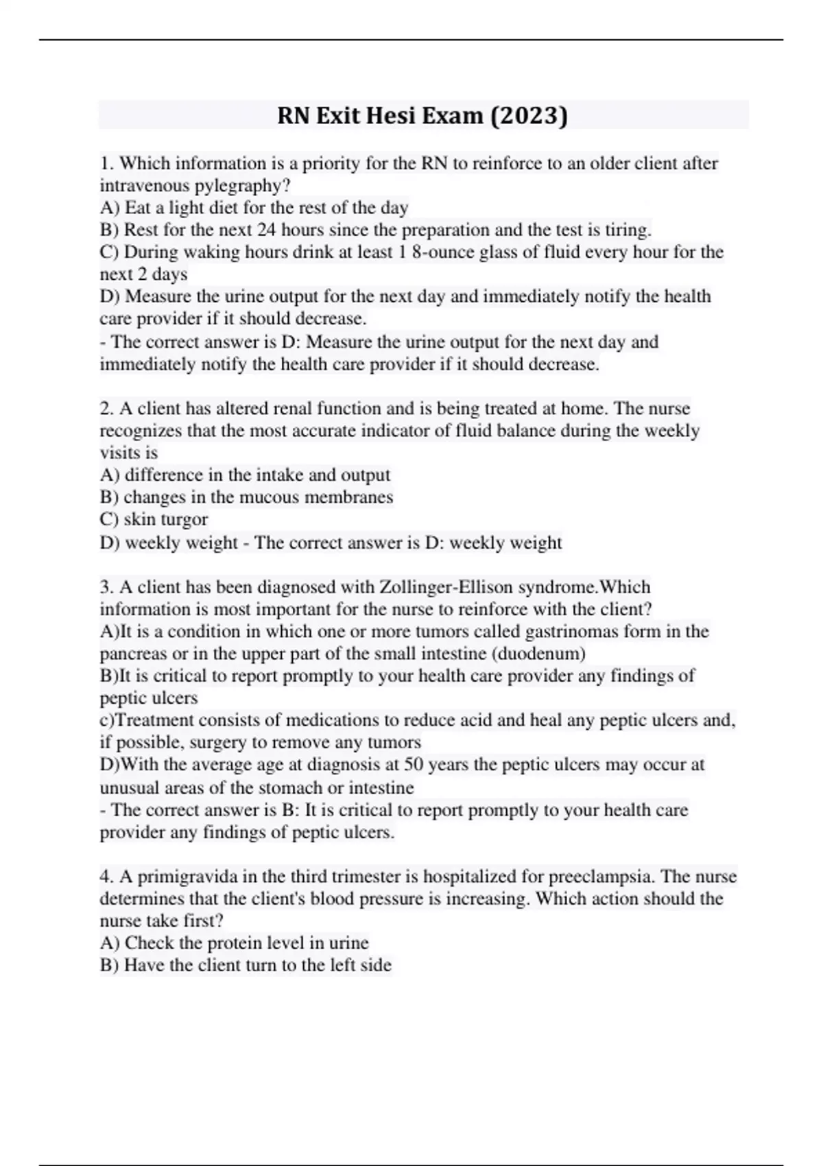 1. Which information is a priority for the RN to reinforce to an older client after intravenous pylegraphy? A) Eat a light diet for the rest of the day B) Rest for the next 24 hours since the preparation and the test is tiring. C) During waking hours drink at least 1 8-ounce glass of fluid every hour for the next 2 days D) Measure the urine output for the next day and immediately notify the health care provider if it should decrease. - The correct answer is D: Measure the urine output for the next day and immediately notify the health care provider if it should decrease. 2. A client has altered renal function and is being treated at home. The nurse recognizes that the most accurate indicator of fluid balance during the weekly visits is A) difference in the intake and output B) changes in the mucous membranes C) skin turgor D) weekly weight - The correct answer is D: weekly weight 3. A client has been diagnosed with Zollinger-Ellison syndrome.Which information is most important for the nurse to reinforce with the client? A)It is a condition in which one or more tumors called gastrinomas form in the pancreas or in the upper part of the small intestine (duodenum) B)It is critical to report promptly to your health care provider any findings of peptic ulcers c)Treatment consists of medications to reduce acid and heal any peptic ulcers and, if possible, surgery to remove any tumors D)With the average age at diagnosis at 50 years the peptic ulcers may occur at unusual areas of the stomach or intestine - The correct answer is B: It is critical to report promptly to your health care provider any findings of peptic ulcers. 4. A primigravida in the third trimester is hospitalized for preeclampsia. The nurse determines that the client's blood pressure is increasing. Which action should the nurse take first? A) Check the protein level in urine B) Have the client turn to the left side C) Take the temperature D) Monitor the urine output - The correct answer is B: Have the client turn to the left side 5. The nurse is caring for a client in atrial fibrillation. The atrial heart rate is 250 and the ventricular rate is controlled at 75. Which of the following findings is cause for the most concern? A) Diminished bowel sounds B) Loss of appetite C) A cold, pale lower leg D) Tachypnea - The correct answer is C: A cold, pale lower leg 6. The client with infective endocarditis must be assessed frequently by the home health nurse. Which finding suggests that antibiotic therapy is not effective, and must be reported by the nurse immediately to the healthcare provider? A) Nausea and vomiting B) Fever of 103 degrees Fahrenheit (39.5 degrees Celsius) C) Diffuse macular rash D) Muscle tenderness - The correct answer is B: Fever of 103 degrees F (39.5 degrees C) 7. A client who had a vasectomy is in the post recovery unit at an outpatient clinic. Which of these points is most important to be reinforced by the nurse? A) Until the health care provider has determined that your ejaculate doesn't contain sperm, continue to use another form of contraception. B) This procedure doesn't impede the production of male hormones or the production of sperm in the testicles. The sperm can no longer enter your semen and no sperm are in your ejaculate. C) After your vasectomy, strenuous activity needs to be avoided for at least 48 hours. If your work doesn't involve hard physical labor, you can return to your job as soon as you feel up to it. The stitches generally dissolve in seven to ten days. D)The health care provider at this clinic recommends rest, ice, an athletic supporter or over-the-counter pain medication to relieve any discomfort. - The correct answer is A: Until the health care provider has determined that your ejaculate doesn't contain sperm, continue to use another form of contraception. 8. A client who is to have antineoplastic chemotherapy tells the nurses of a fear of being sick all the time and wishes to try acupuncture. Which of these beliefs stated by the client would be incorrect about acupuncture? A)Some needles go as deep as 3 inches, depending on where they're placed in the body and what the treatment is for. The needles usually are left in for 15 to 30 minutes. B) In traditional Chinese medicine, imbalances in the basic energetic flow of life —known as qi or chi — are thought to cause illness. * C) The flow of life is believed to flow through major pathways or nerve clusters in your body. D) By inserting extremely fine needles into some of the over 400 acupuncture points in various combinations it is believed that energy flow will rebalance to allow the body's natural healing mechanisms to take over. - The correct answer is C: The flow of life is believed to flow through major pathways or nerve clusters in your body. 9. The nurse is discussing with a group of students the disease Kawasaki. What statement made by a student about Kawasaki disease is incorrect? A)It also called mucocutaneous lymph node syndrome because it affects the mucous membranes (inside the mouth, throat and nose), skin and lymph nodes. B)In the second phase of the disease, findings include peeling of the skin on the hands and feet with joint and abdominal pain C)Kawasaki disease occurs most often in boys, children younger than age 5 and children of Hispanic descent D)Initially findings are a sudden high fever, usually above 104 degrees Fahrenheit, which lasts 1 to 2 weeks - The correct answer is C: Kawasaki disease occurs most often in boys, children younger than age 5 and children of Hispanic descent 10. A client has viral pneumonia affecting 2/3 of the right lung. What would be the best position to teach the client to lie in every other hour during first 12 hours after admission? A) Side-lying on the left with the head elevated 10 degrees B) Side-lying on the left with the head elevated 35 degrees C) Side-lying on the right with the head elevated 10 degrees D) Side-lying on the right with the head elevated 35 degrees - The correct an
