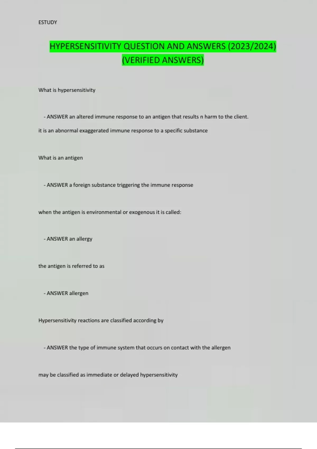 HYPERSENSITIVITY QUESTION AND ANSWERS (2023/2024) (VERIFIED ANSWERS)