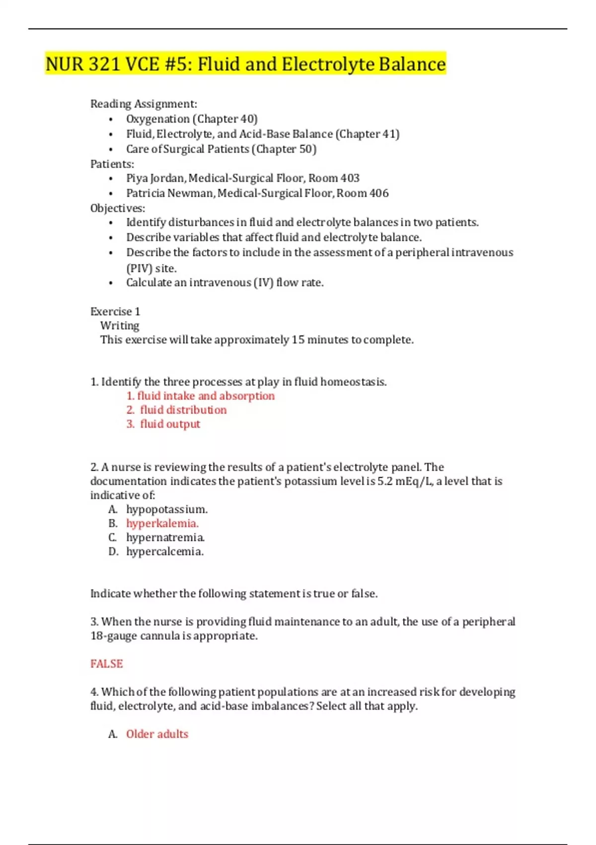 NUR 321 VCE #5 Fluid and Electrolyte Balance Answered 2021.