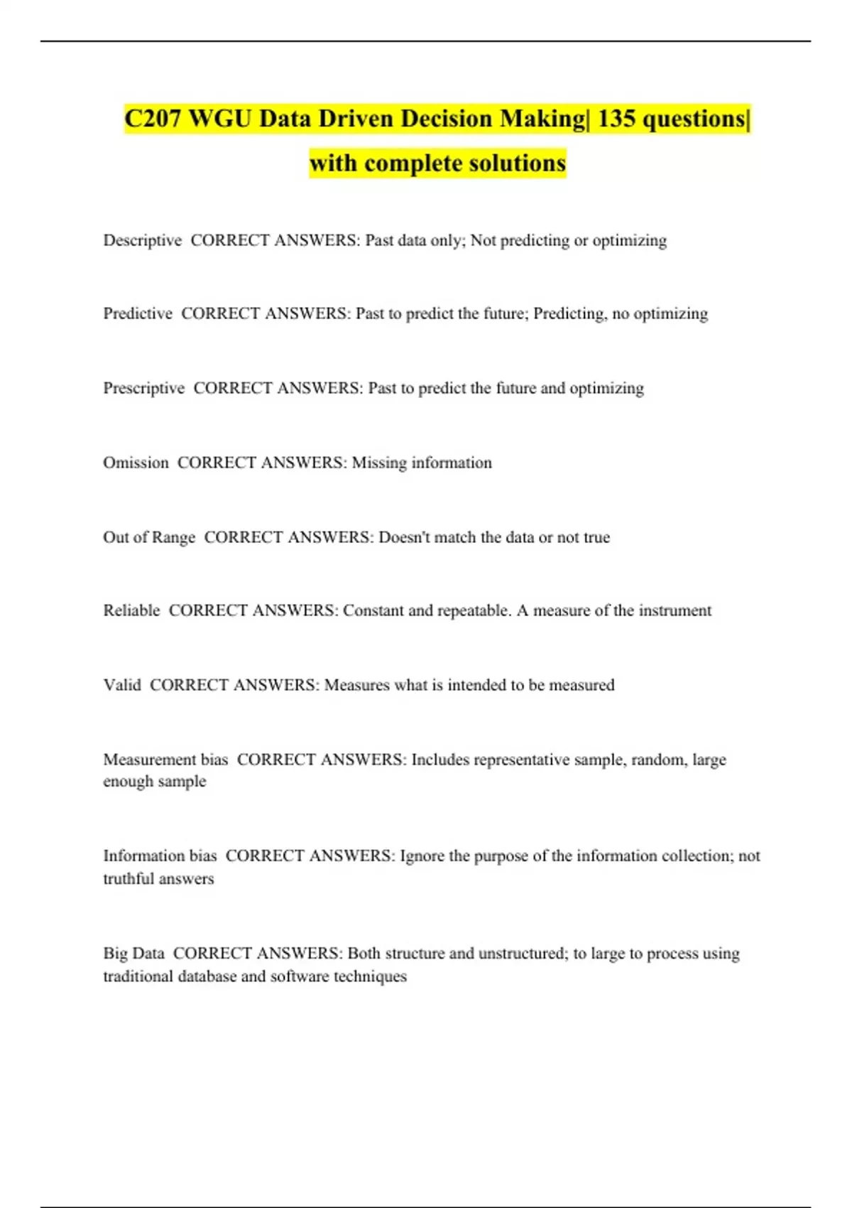 C207 WGU Data Driven Decision Making| 135 questions| with complete solutions