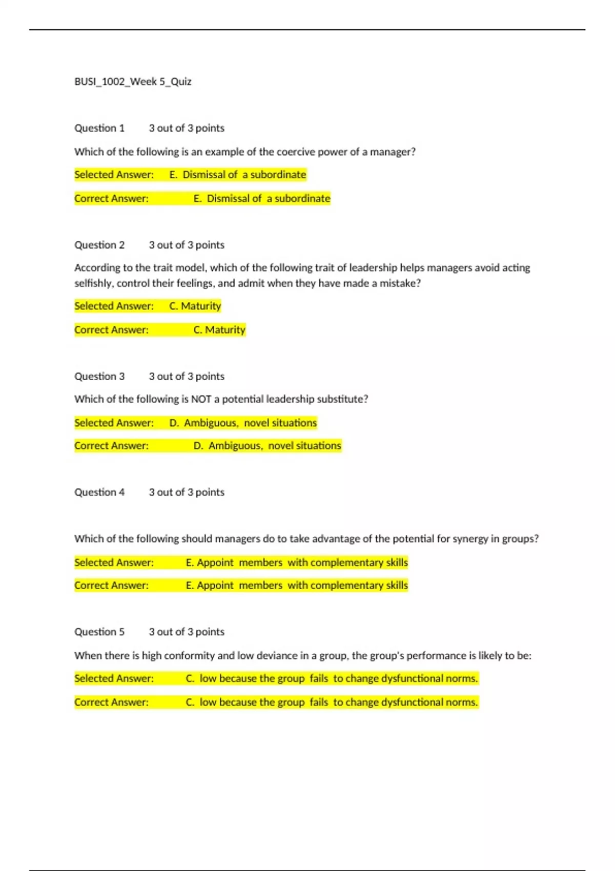 BUSI_1002_Week 5_Quiz Question 1 3 out of 3 points Which of the following is an example of the coercive power of a manager? Selected Answer: E. Dismissal of a subordinate Correct Answer: E. Dismissal of a subordinate Question 2 3 out of 3 points According to the trait model, which of the following trait of leadership helps managers avoid acting selfishly, control their feelings, and admit when they have made a mistake? Selected Answer: C. Maturity Correct Answer: C. Maturity Question 3 3 out of 3 points Which of the following is NOT a potential leadership substitute? Selected Answer: D. Ambiguous, novel situations Correct Answer: D. Ambiguous, novel situations Question 4 3 out of 3 points Which of the following should managers do to take advantage of the potential for synergy in groups? Selected Answer: E. Appoint members with complementary skills Correct Answer: E. Appoint members with complementary skills Question 5 3 out of 3 points When there is high conformity and low deviance in a group, the group's performance is likely to be: Selected Answer: C. low because the group fails to change dysfunctional norms. Correct Answer: C. low because the group fails to change dysfunctional norms. Question 6 3 out of 3 points A member of a task force does not do much work related to the goals of the task force. This member is confident that the other members of the task force "will take up the slack." This group member is exhibiting: Selected Answer: E. social loafing. Correct Answer: E. social loafing. Question 7 3 out of 3 points A software firm as an opening for a software programmer. The HR manager of the firm is trying to list all the tasks, duties, and responsibilities that make up a software programmers job. He then lists the knowledge, skills, and abilities that a candidate should posses in order for him/her to perform the job. Which of the following best describes what the HR manager is doing? Selected Answer: E. Job analysis Correct Answer: E. Job analysis Question 8 3 out of 3 points Katy is a manager in a large restaurant chain. She wants to use situational interview questions while interviewing candidates for the post of servers. Which of the following question would she ask? Selected D. Answer: What would you do if a customer wanted to be seated away from small children? Correct Answer: D. What would you do if a customer wanted to be seated away from small children? Question 9 3 out of 3 points Which of the following best explains the process in which a manager evaluates the performance of a subordinate in terms of the actual outcomes of the work behaviors of that subordinate? Selected Answer: A. A results appraisal Correct Answer: A. A results appraisal