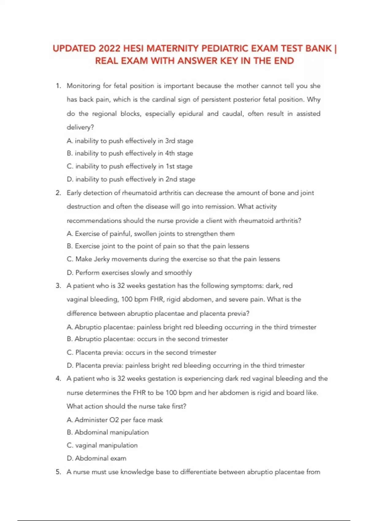UPDATED 2022 HESI MATERNITY PEDIATRIC EXAM TEST BANK | REAL EXAM WITH ANSWER KEY IN THE END Monitoring for fetal position is important because the mother cannot tell you she has back pain, which is the cardinal sign of persistent posterior fetal position. Why do the regional blocks, especially epidural and caudal, often result in assisted delivery? A. inability to push effectively in 3rd stage B. inability to push effectively in 4th stage C. inability to push effectively in 1st stage D. inability to push effectively in 2nd stage 2. Early detection of rheumatoid arthritis can decrease the amount of bone and joint destruction and often the disease will go into remission. What activity recommendations should the nurse provide a client with rheumatoid arthritis? A. Exercise of painful, swollen joints to strengthen them B. Exercise joint to the point of pain so that the pain lessens C. Make Jerky movements during the exercise so that the pain lessens D. Perform exercises slowly and smoothly 3. A patient who is 32 weeks gestation has the following symptoms: dark, red vaginal bleeding, 100 bpm FHR, rigid abdomen, and severe pain. What is the difference between abruptio placentae and placenta previa? A. Abruptio placentae: painless bright red bleeding occurring in the third trimester B. Abruptio placentae: occurs in the second trimester C. Placenta previa: occurs in the second trimester D. Placenta previa: painless bright red bleeding occurring in the third trimester 4. A patient who is 32 weeks gestation is experiencing dark red vaginal bleeding and the nurse determines the FHR to be 100 bpm and her abdomen is rigid and board like. What action should the nurse take first? A. Administer O2 per face mask B. Abdominal manipulation C. vaginal manipulation D. Abdominal exam 5. A nurse must use knowledge base to differentiate between abruptio placentae from placenta previa. What assessments should be done in case of a patient suspected of