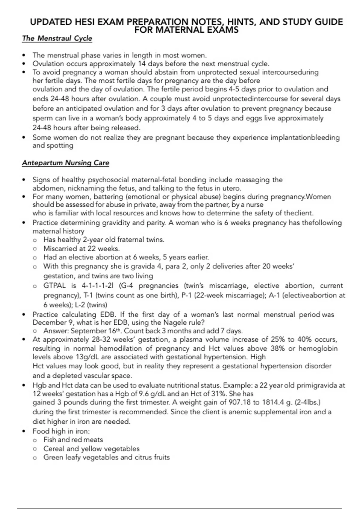 UPDATED HESI EXAM PREPARATION NOTES, HINTS, AND STUDY GUIDE FOR MATERNAL EXAMS