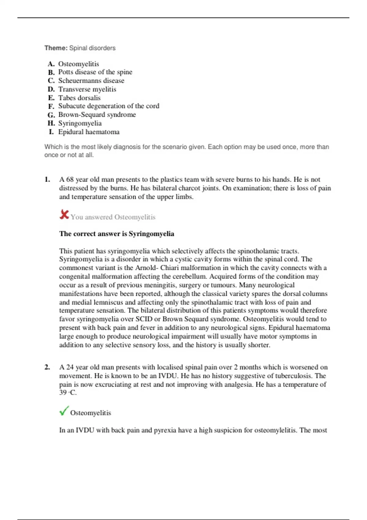 favor syringomyelia over SCID or Brown Sequard syndrome. Osteomyelitis would tend to
