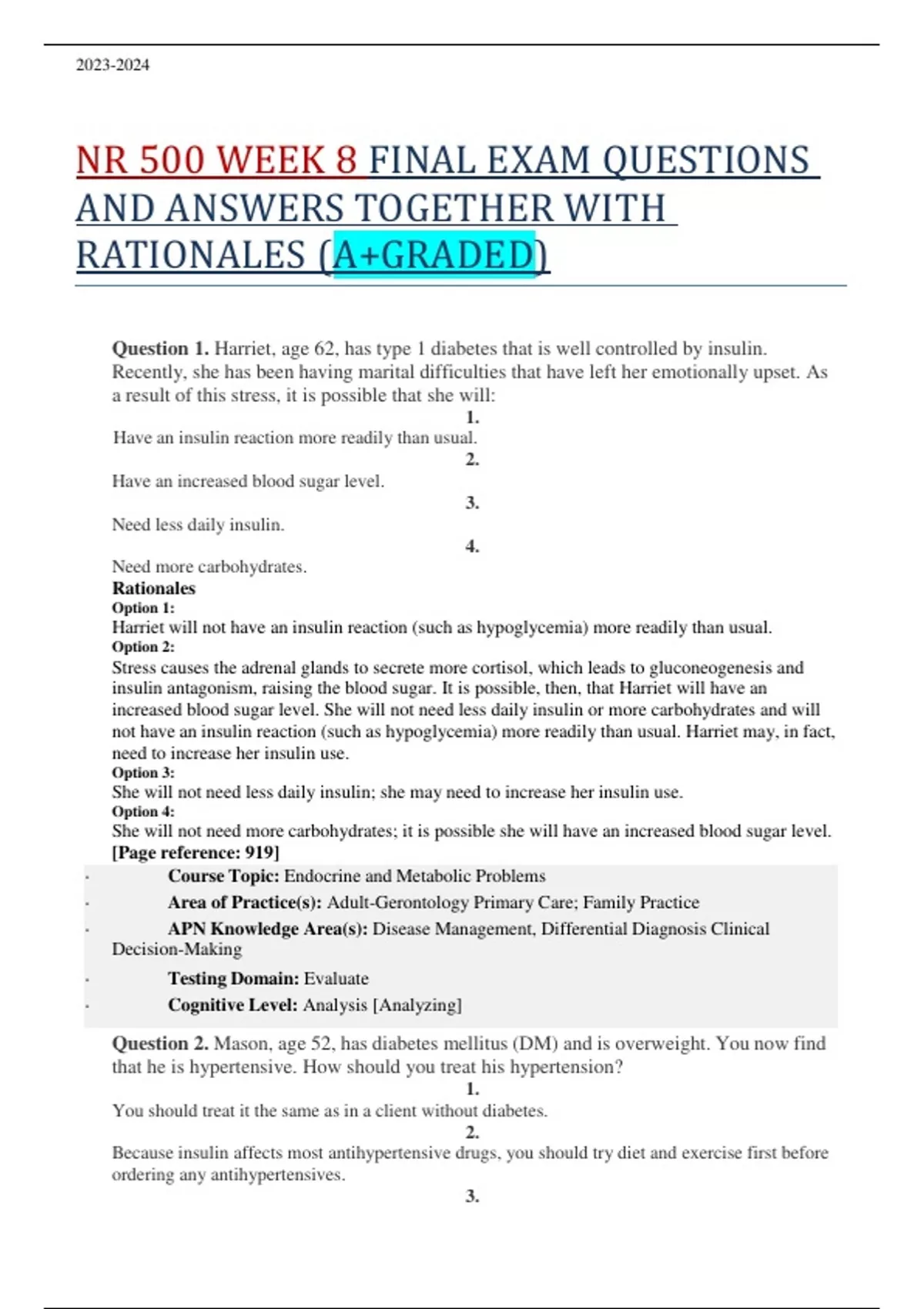 NR 500 WEEK 8 FINAL EXAM QUESTIONS AND ANSWERS TOGETHER WITH RATIONALES (A+GRADED)