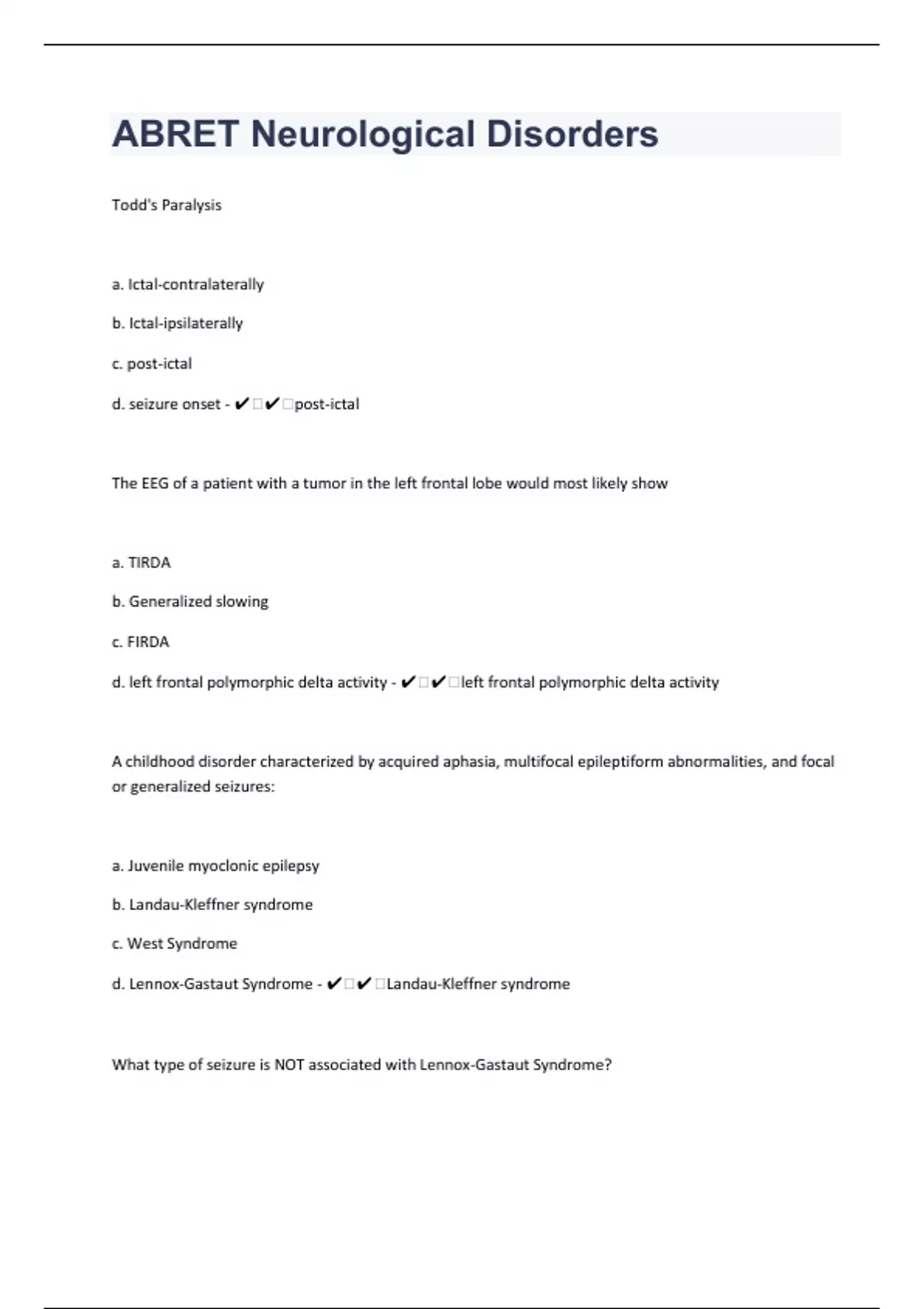 Todd's Paralysis a. Ictal-contralaterally b. Ictal-ipsilaterally c. post-ictal d. seizure onset - ️️post-ictal The EEG of a patient with a tumor in the left frontal lobe would most likely show a. TIRDA b. Generalized slowing c. FIRDA d. left frontal polymorphic delta activity - ️️left frontal polymorphic delta activity A childhood disorder characterized by acquired aphasia, multifocal epileptiform abnormalities, and focal or generalized seizures: a. Juvenile myoclonic epilepsy b. Landau-Kleffner syndrome c. West Syndrome d. Lennox-Gastaut Syndrome - ️️Landau-Kleffner syndrome