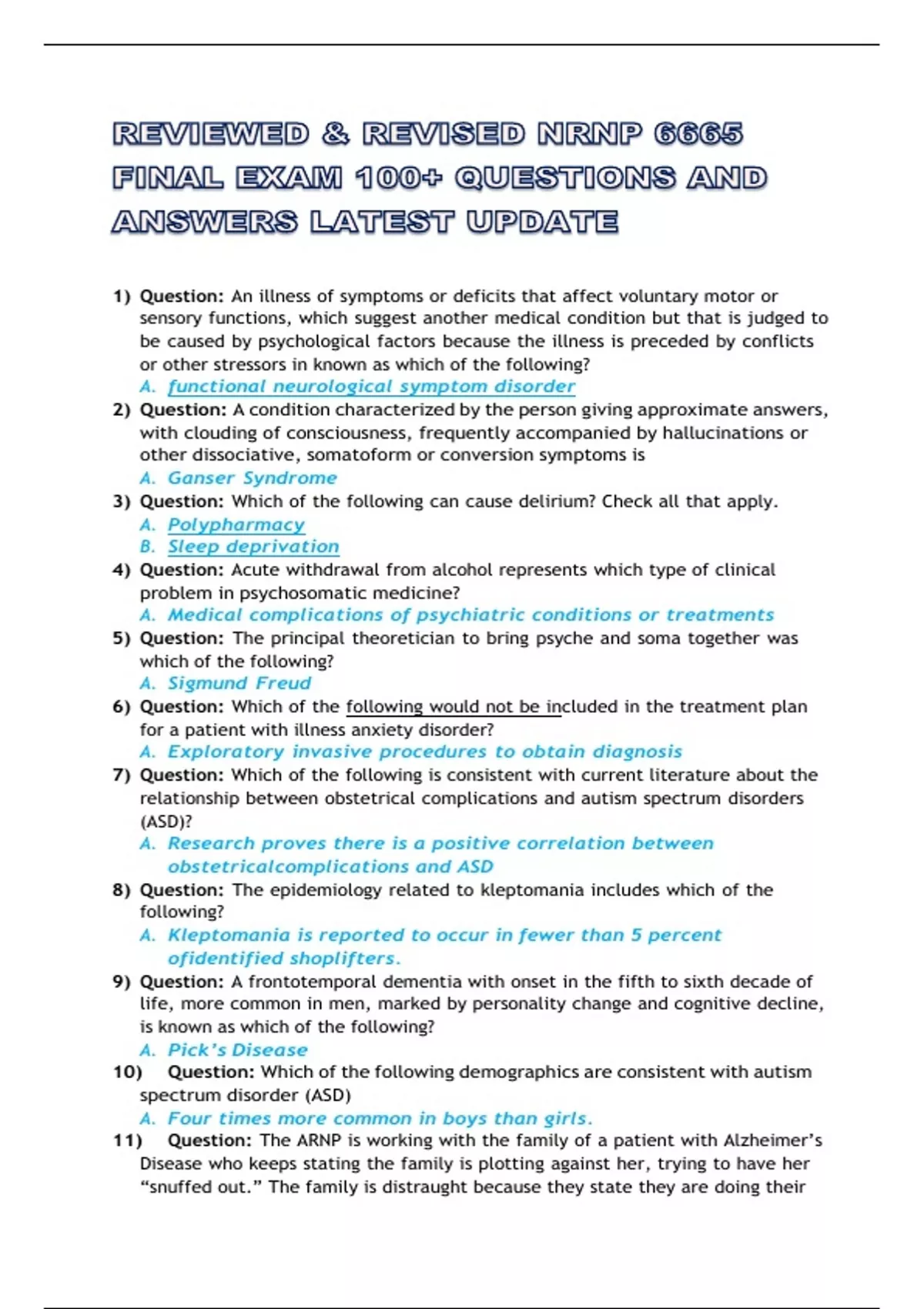REVIEWED & REVISED NRNP 6665 FINAL EXAM 100+ QUESTIONS AND ANSWERS LATEST UPDATE 1) Question: An illness of symptoms or deficits that affect voluntary motor or sensory functions, which suggest another medical condition but that is judged to be caused by psychological factors because the illness is preceded by conflicts or other stressors in known as which of the following? A. functional neurological symptom disorder 2) Question: A condition characterized by the person giving approximate answers, with clouding of consciousness, frequently accompanied by hallucinations or other dissociative, somatoform or conversion symptoms is A. Ganser Syndrome 3) Question: Which of the following can cause delirium? Check all that apply. A. Polypharmacy B. Sleep deprivation 4) Question: Acute withdrawal from alcohol represents which type of clinical problem in psychosomatic medicine? A. Medical complications of psychiatric conditions or treatments 5) Question: The principal theoretician to bring psyche and soma together was which of the following? A. Sigmund Freud 6) Question: Which of the following would not be included in the treatment plan for a patient with illness anxiety disorder? A. Exploratory invasive procedures to obtain diagnosis 7) Question: Which of the following is consistent with current literature about the relationship between obstetrical complications and autism spectrum disorders (ASD)? A. Research proves there is a positive correlation between obstetrical complications and ASD 8) Question: The epidemiology related to kleptomania includes which of the following? A. Kleptomania is reported to occur in fewer than 5 percent of identified shoplifters. 9) Question: A frontotemporal dementia with onset in the fifth to sixth decade of life, more common in men, marked by personality change and cognitive decline, is known as which of the following? A. Pick’s Disease 10) Question: Which of the following demographics are consistent with autism spectrum disorder (ASD) A. Four times more common in boys than girls. 11) Question: The ARNP is working with the family of a patient with Alzheimer’s Disease who keeps stating the family is plotting against her, trying to have her “snuffed out.” The family is distraught because they state they are doing their best to make sure their family member is safe. The ARNP explains which of the following in educating the patient about the patient’s A. The patient is delusional. An estimated 30 to 40 percent of patients with dementia have delusions 12) Question: Which of the following persons hypothesized that the symptoms of conversion disorder reflect unconscious conflict? A. Sigmund Freud 13) Question: Which of the following is consistent within normal range developmental milestones in adaptive skills for a 4-year-old? A. Toilets self alone; uses fork 14) Question: A temporary marked alteration in the state of consciousness or by the customary sense of personal identity without the replacement by an alternate sense of identity is known as which of the following? A. Dissociative trance disorder 15) Question: Differential diagnoses to be considered when diagnosing Ganser syndrome include which of the following? A. All the above (organic dementia, depressive pseudodementia, Korsakoff’s syndrome) 16) Question: A patient who has been raped, presents with the inability to recall important personal information and any information about the rape, does recall events prior and since. There does not appear to be any physiological reason for this. This presentation is consistent with which of the following diagnoses? A. Dissociative amnesia 17) Question: Depersonalization can result from which of the following conditions? Check all that apply. A. Seizure disorders 18) Question: A child who demonstrates repetitive significant violations of social rules and the rights of others over the course of a year would likely be diagnosed with which of the following diagnoses? A. Conduct Disorder 19) Question: A sudden unexpected purposeful travel away from home with inability to recall all of one’s past accompanied by confusion about personal identity not due to direct effects of a substance or a general medical condition which causes clinically significant distress or impairment in social, occupational, or other important areas of functioning is most specifically known as which of the following? A. Dissociative fugue 20) Question: Which of the following is NOT considered a nonpathological form of amnesia? A. Generalized Amnesia 21) Question: The diagnosis formerly known as multiple personality disorder is now known as which of the following? A. Dissociative Identity Disorder