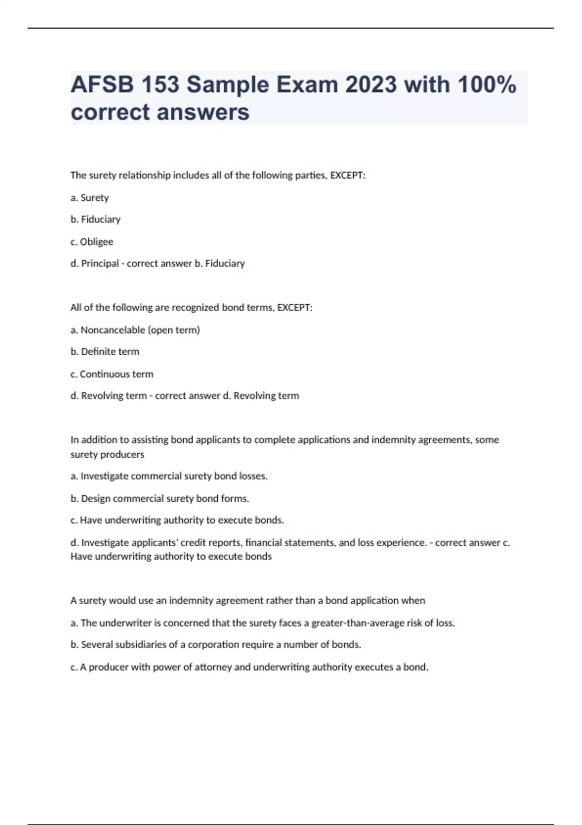The surety relationship includes all of the following parties, EXCEPT: a. Surety b. Fiduciary c. Obligee d. Principal - correct answer b. Fiduciary All of the following are recognized bond terms, EXCEPT: a. Noncancelable (open term) b. Definite term c. Continuous term d. Revolving term - correct answer d. Revolving term In addition to assisting bond applicants to complete applications and indemnity agreements, some surety producers a. Investigate commercial surety bond losses. b. Design commercial surety bond forms. c. Have underwriting authority to execute bonds. d. Investigate applicants' credit reports, financial statements, and loss experience. - correct answer c. Have underwriting authority to execute bonds A surety would use an indemnity agreement rather than a bond application when a. The underwriter is concerned that the surety faces a greater-than-average risk of loss. b. Several subsidiaries of a corporation require a number of bonds. c. A producer with power of attorney and underwriting authority executes a bond. d. The surety reuqires signed indmenity agreements for all bonds. - correct answer b. Several subsidiaries of a corporation require a number of bonds. An underwriter determines the surety's ability to cancel a bond and the period of subsequent liability by a. Reviewing the bond form
