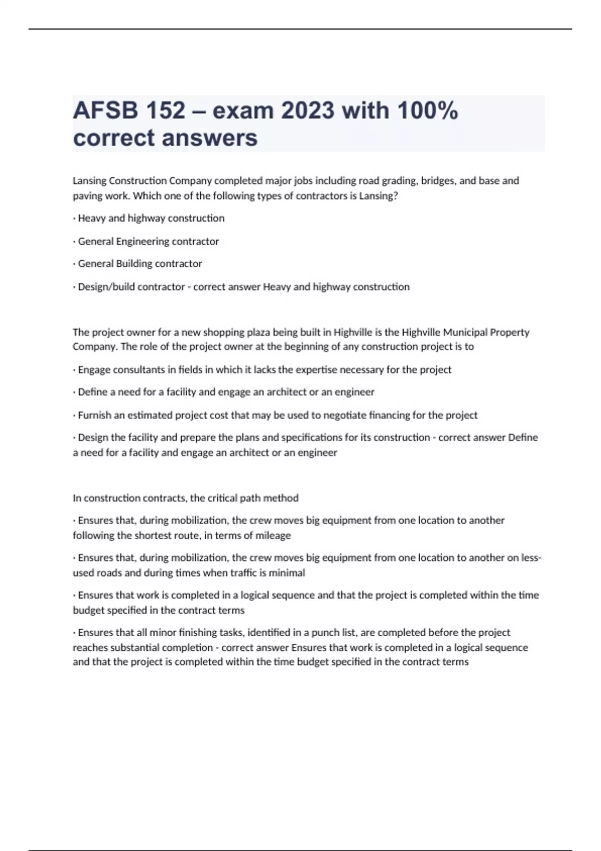 Lansing Construction Company completed major jobs including road grading, bridges, and base and paving work. Which one of the following types of contractors is Lansing? · Heavy and highway construction · General Engineering contractor · General Building contractor · Design/build contractor - correct answer Heavy and highway construction The project owner for a new shopping plaza being built in Highville is the Highville Municipal Property Company. The role of the project owner at the beginning of any construction project is to · Engage consultants in fields in which it lacks the expertise necessary for the project · Define a need for a facility and engage an architect or an engineer · Furnish an estimated project cost that may be used to negotiate financing for the project · Design the facility and prepare the plans and specifications for its construction - correct answer Define a need for a facility and engage an architect or an engineer In construction contracts, the critical path method · Ensures that, during mobilization, the crew moves big equipment from one location to another following the shortest route, in terms of mileage · Ensures that, during mobilization, the crew moves big equipment from one location to another on less-used roads and during times when traffic is minimal · Ensures that work is completed in a logical sequence and that the project is completed within the time budget specified in the contract terms · Ensures that all minor finishing tasks, identified in a punch list, are completed before the project reaches substantial completion - correct answer Ensures that work is completed in a logical sequence and that the project is completed within the time budget specified in the contract terms The party that directly benefits from the additional security of knowing that the contractor has satisfied the surety's comp