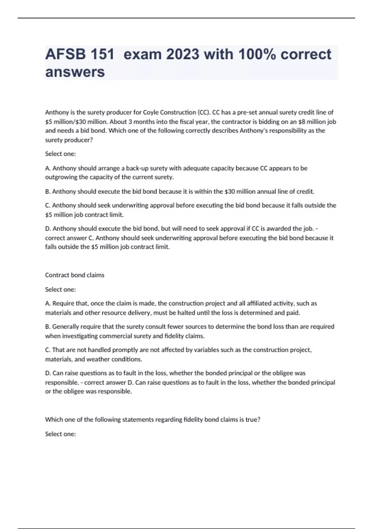 Anthony is the surety producer for Coyle Construction (CC). CC has a pre-set annual surety credit line of $5 million/$30 million. About 3 months into the fiscal year, the contractor is bidding on an $8 million job and needs a bid bond. Which one of the following correctly describes Anthony's responsibility as the surety producer? Select one: A. Anthony should arrange a back-up surety with adequate capacity because CC appears to be outgrowing the capacity of the current surety. B. Anthony should execute the bid bond because it is within the $30 million annual line of credit. C. Anthony should seek underwriting approval before executing the bid bond because it falls outside the $5 million job contract limit. D. Anthony should execute the bid bond, but will need to seek approval if CC is awarded the job. - correct answer C. Anthony should seek underwriting approval before executing the bid bond because it falls outside the $5 million job contract limit. Contract bond claims Select one: A. Require that, once the claim is made, the construction project and all affiliated activity, such as materials and other resource delivery, must be halted until the loss is determined and paid. B. Generally require that the surety consult fewer sources to determine the bond loss than are required when investigating commercial surety and fidelity claims. C. That are not handled promptly are not affected by variables such as the construction project, materials, and weather conditions. D. Can raise questions as to fault in the loss, whether the bonded principal or the obligee was responsible. - correct answer D. Can raise questions as to fault in the loss, whether the bonded principal or the obligee was responsible. Which one of the following statements regarding fidelity bond claims is true? Select one: A. There are no time limits for bringing claims under a fidelity bond, so an insurer does not need to be concerned about whether the loss was discovered during the policy term. B. The insured's prompt notice of loss and the fidelity's prompt investigation has no impact on the ins