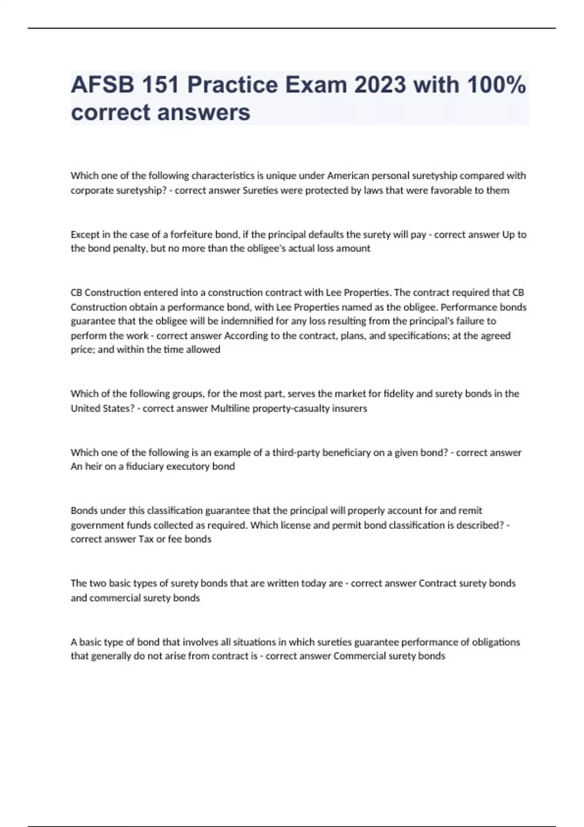 Which one of the following characteristics is unique under American personal suretyship compared with corporate suretyship? - correct answer Sureties were protected by laws that were favorable to them Except in the case of a forfeiture bond, if the principal defaults the surety will pay - correct answer Up to the bond penalty, but no more than the obligee's actual loss amount CB Construction entered into a construction contract with Lee Properties. The contract required that CB Construction obtain a performance bond, with Lee Properties named as the obligee. Performance bonds guarantee that the obligee will be indemnified for any loss resulting from the principal's failure to perform the work - correct answer According to the contract, plans, and specifications; at the agreed price; and within the time allowed Which of the following groups, for the most part, serves the market for fidelity and surety bonds in the United States? - correct answer Multiline property-casualty insurers Which one of the following is an example of a third-party beneficiary on a given bond? - correct answer An heir on a fiduciary executory bond Bonds under this classification guarantee that the principal will properly account for and remit government funds collected as required. Which license and permit bond classification is described? - correct answer Tax or fee bonds The two basic types of surety bonds that are written today are - correct answer Contract surety bonds and commercial surety bonds A basic type of bond that involves all situations in which sureties guarantee performance of obligations that generally do not arise from contract is - correct answer Commercial surety bonds When evalua