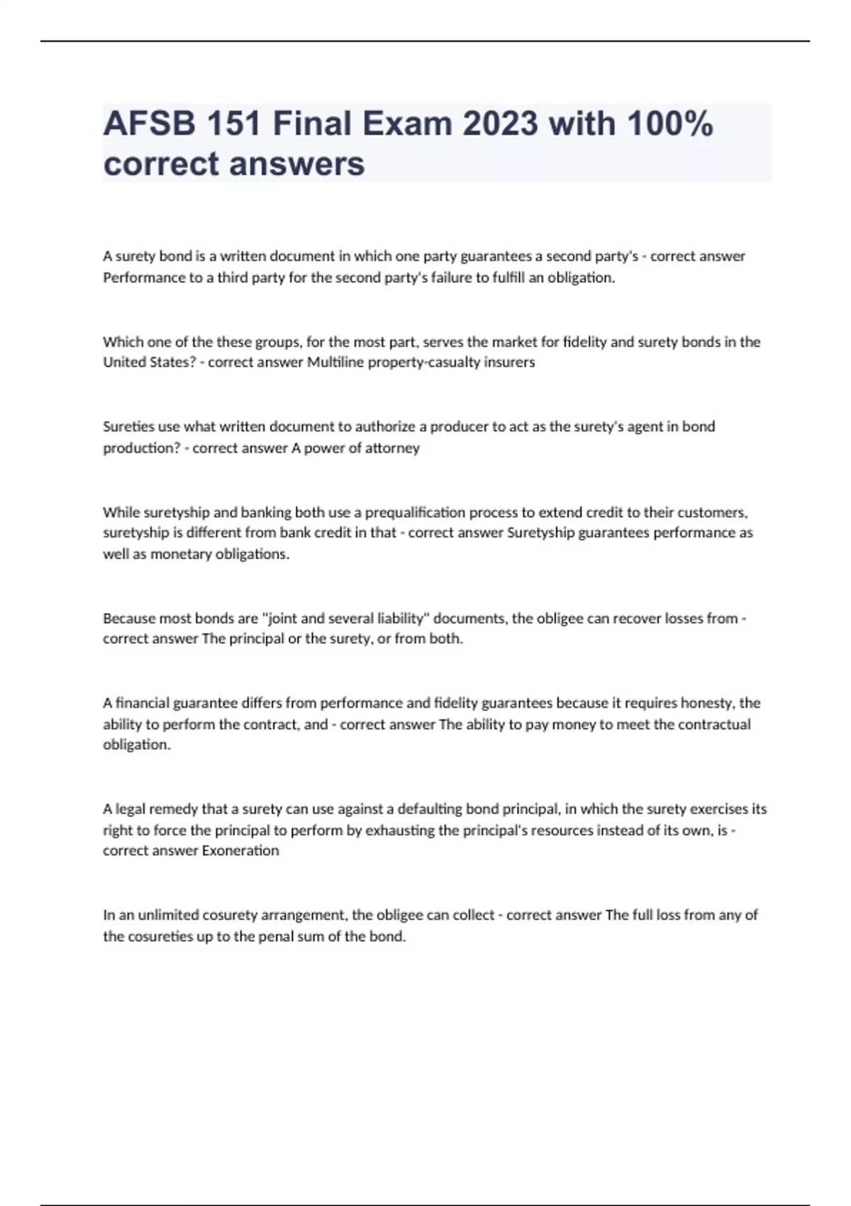 A surety bond is a written document in which one party guarantees a second party's - correct answer Performance to a third party for the second party's failure to fulfill an obligation. Which one of the these groups, for the most part, serves the market for fidelity and surety bonds in the United States? - correct answer Multiline property-casualty insurers Sureties use what written document to authorize a producer to act as the surety's agent in bond production? - correct answer A power of attorney While suretyship and banking both use a prequalification process to extend credit to their customers, suretyship is different from bank credit in that - correct answer Suretyship guarantees performance as well as monetary obligations. Because most bonds are "joint and several liability" documents, the obligee can recover losses from - correct answer The principal or the surety, or from both. A financial guarantee differs from performance and fidelity guarantees because it requires honesty, the ability to perform the contract, and - correct answer The ability to pay money to meet the contractual obligation. A legal remedy that a surety can use against a defaulting bond principal, in which the surety exercises its right to force the principal to perform by exhausting the principal's resources instead of its own, is - correct answer Exoneration In an unlimited cosurety arrangement, the obligee can collect - correct answer The full loss from any of the cosureties up to the penal sum of the bond. A bond that