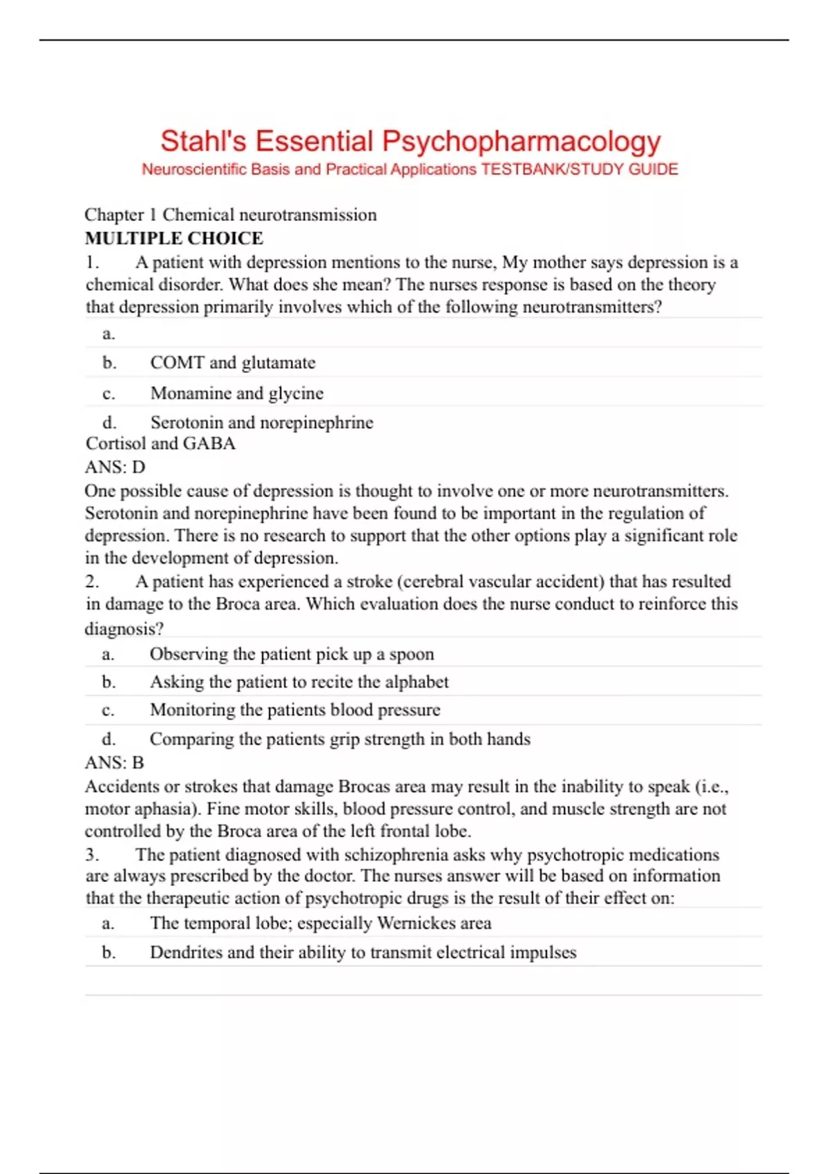 Test Bank For Stahl's Essential Psychopharmacology Neuroscientific Basis and Practical Applications