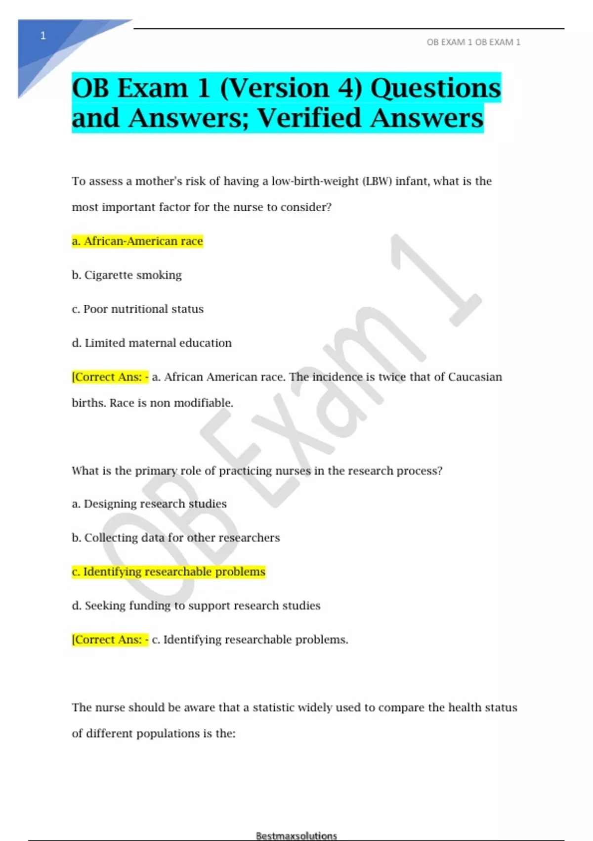 OB Exam 1 (Version 4) Questions and Answers; Verified Answers