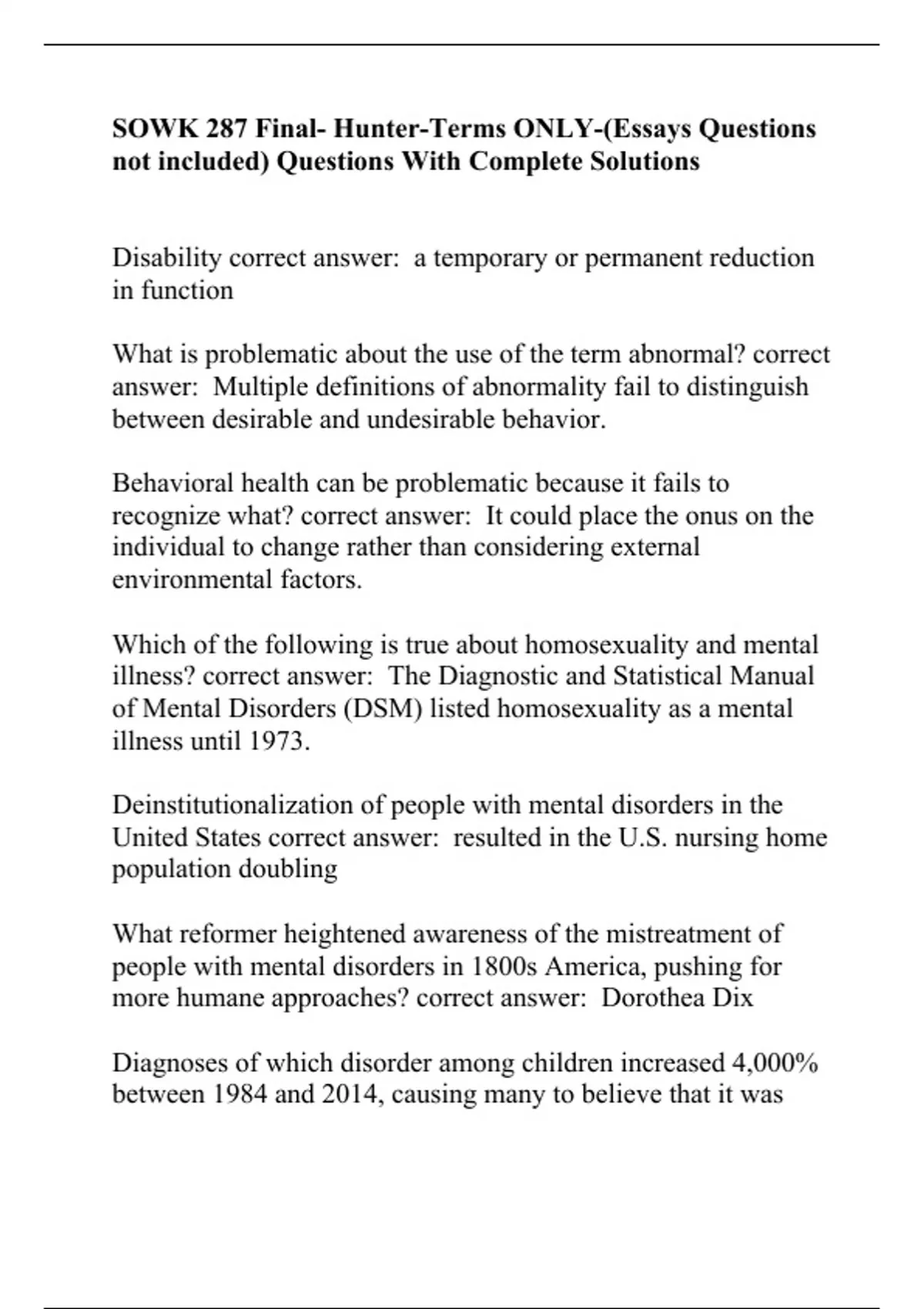 Disability correct answer: a temporary or permanent reduction in function What is problematic about the use of the term abnormal? correct answer: Multiple definitions of abnormality fail to distinguish between desirable and undesirable behavior. Behavioral health can be problematic because it fails to recognize what? correct answer: It could place the onus on the individual to change rather than considering external environmental factors. Which of the following is true about homosexuality and mental illness? correct answer: The Diagnostic and Statistical Manual of Mental Disorders (DSM) listed homosexuality as a mental illness until 1973. Deinstitutionalization of people with mental disorders in the United States correct answer: resulted in the U.S. nursing home population doubling What reformer heightened awareness of the mistreatment of people with mental disorders in 1800s America, pushing for more humane approaches? correct answer: Dorothea Dix Diagnoses of which disorder among children increased 4,000% between 1984 and 2014, causing many to believe that it was perhaps simply becoming a more popular diagnosis among practitioners, rather than actually occurring more frequently? correct answer: Bipolar disorder Alzheimers is correct answer: a neurocognitive disorder In Wyatt v. Stickney (1971) and O'Connor v. Donaldson (1975), the Supreme Court ruled that correct answer: a client could not be hospitalized against his or her will simply for having a mental illness and needing treatment; a more specific set of guidelines had to be met Licensed clinical social workers are directly responsible for correct answer: assessing, diagnosing, and treating all forms of mental disorders Developmental challenge correct answer: a severe chronic condition that manifests before age of 22
