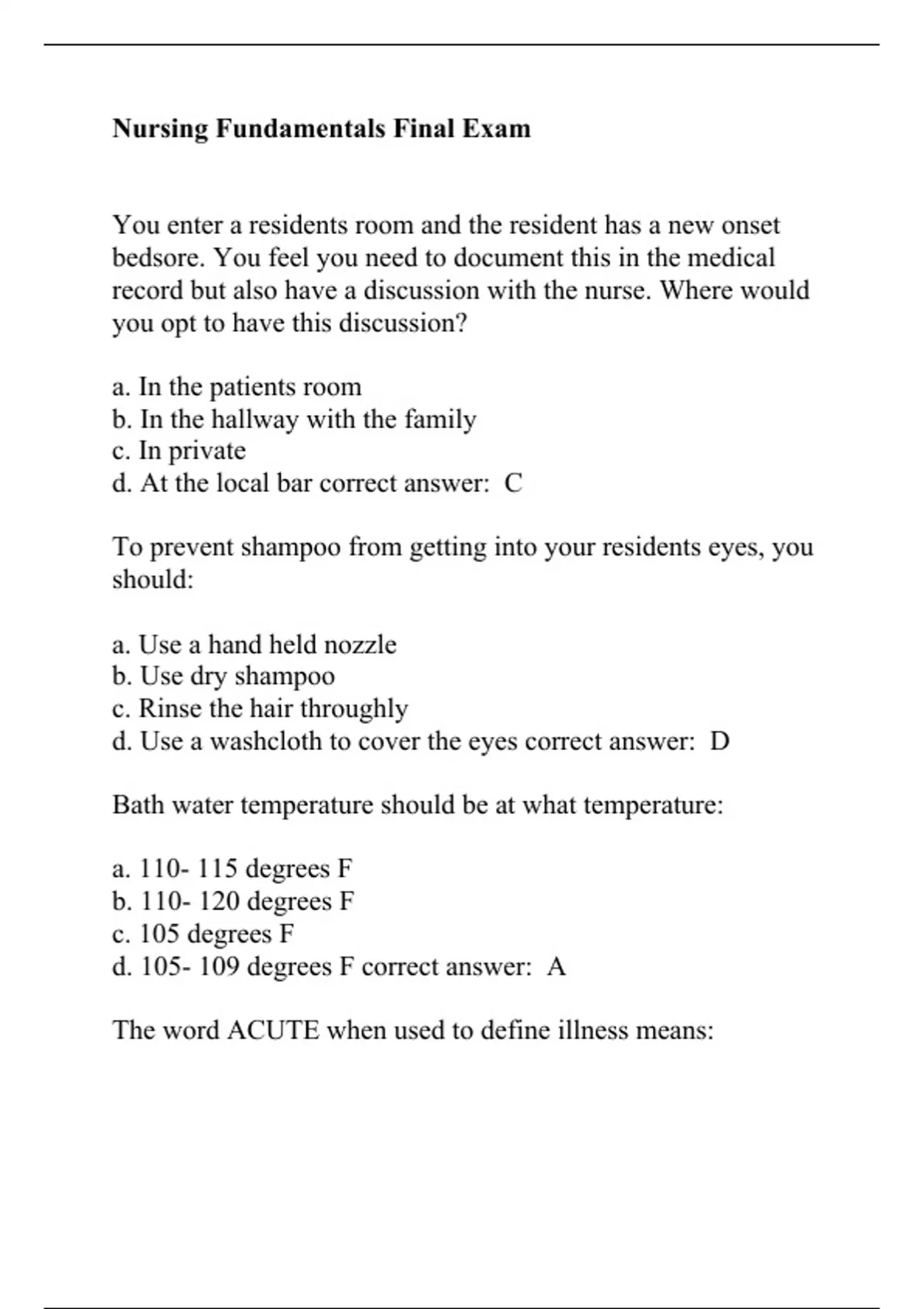 You enter a residents room and the resident has a new onset bedsore. You feel you need to document this in the medical record but also have a discussion with the nurse. Where would you opt to have this discussion? a. In the patients room b. In the hallway with the family c. In private d. At the local bar correct answer: C To prevent shampoo from getting into your residents eyes, you should: a. Use a hand held nozzle b. Use dry shampoo c. Rinse the hair throughly d. Use a washcloth to cover the eyes correct answer: D Bath water temperature should be at what temperature: a. 110- 115 degrees F b. 110- 120 degrees F c. 105 degrees F d. 105- 109 degrees F correct answer: A The word ACUTE when used to define illness means: a. an illness for which there is no reasonable expectation of recovery b. an ongoing illness for which there is no cure c. a sudden onset to an illness d. an illness that is gradual correct answer: C In your role as a nursing assistant, you are able to: a. You can take verbal orders over the phone from doctors b. Give medications c. Insert a foley in the patients vagina or penis d. Report changes in the residents condition to the nurse correct answer: D An assisted living facility provides all of the following except: a. Housing b. Personal care c. Social activities d. 24 hour skilled nursing care correct answer: D Those persons who provide basic nursing care under the supervision of a registered nurse or a licensed practical nurse are: a. Licensed practical nurse b. Case managers c. Assistive personnel d. The "health care team" correct answer: C A federal insurance plan providing benefits for older persons and some younger persons with disabilities is called: a. Medicaid b. Medicare c. Blue Cross/ Blue Shield d. Coventry correct answer: B Which nursing care pattern focuses on tasks and jobs? a. Functional nursing b. Team nursing c. Primary nursing d. Care management correct answer: A
