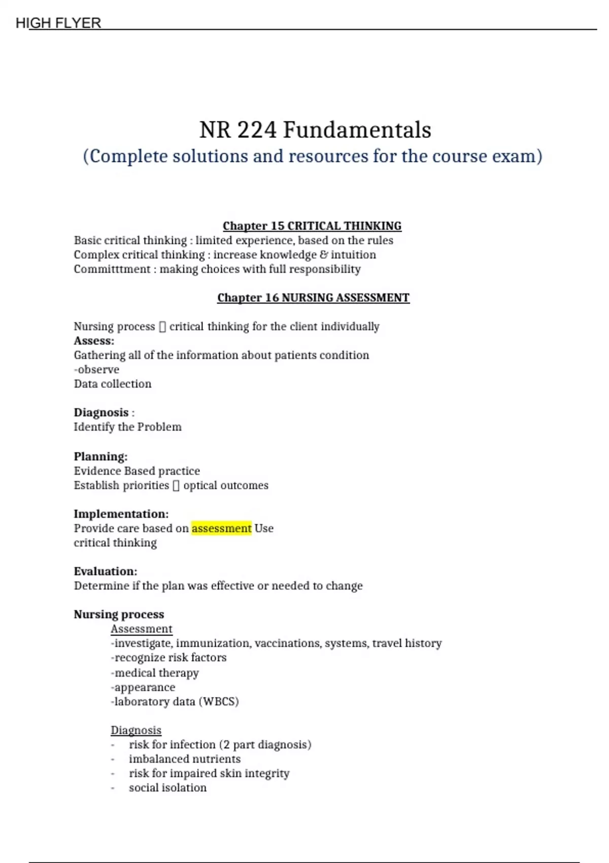 Chapter 15 CRITICAL THINKING Basic critical thinking : limited experience, based on the rules Complex critical thinking : increase knowledge & intuition Committtment : making choices with full responsibility Chapter 16 NURSING ASSESSMENT Nursing process critical thinking for the client individually Assess: Gathering all of the information about patients condition -observe Data collection Diagnosis : Identify the Problem Planning: Evidence Based practice Establish priorities optical outcomes Implementation: Provide care based on assessment Use critical thinking Evaluation: Determine if the plan was effective or needed to change Nursing process Assessment -investigate, immunization, vaccinations, systems, travel history -recognize risk factors -medical therapy -appearance -laboratory data (WBCS) Diagnosis - risk for infection (2 part diagnosis) - imbalanced nutrients - risk for impaired skin integrity - social isolation HIGH FLYER - impaired tissue - readiness for enhanced immunizations Planning HIGH FLYER -smart goals, realistic -preventing exposure to infectious organism -control or reduce extent to infection -verbalizing understanding of infection prevention and control (hand watching) Implementation -health promotion (prevention of development) -acute care Critical thinking : collect/verify data analyze data Sources of date: Patient (interview, observation physical exam) BEST SOURCE!! -use own words & use quotation marks Family & SO (agreement first) Health care team Medical records Scientific literature HIPAA- indivuadlly information in verbal and electronical CHAPTER 26 DOCUMENTATION AND INFORMATICS CHAPTER 27 PATIENT SAFETY CHAPTER 28 IMMOBILITY DVT: unilateral edema, pain, redness in one leg/calf -elevate affected leg, admin anticoagulants -increase activity (every 2 hours) and change positions -SCD cuffs, compression stockings -NO PILLOW AT KNEES Cane: 2 points of support, position cane on stronger unaffected side, move cane forward, move weaker leg to leg, stronger leg past the cane Walker: advance walker 12 inches, advance affected leg, then unaffected forward Crutches: adjust 3 finger widths, elbows flexed @ 30 degrees Tripod position, move unaffected leg forward above crutches Sitting/rising: on unaffected side HIGH FLYER Up stairs: step up with unaffected leg , bring injured leg and crutches up and a bove Integumentary: skin lack of circulation pressure ulcers Protein, move every 15 mins, 1 hr in chiar, Q2 turns, Metabolic: maintain metabolism I&O, wound healing, high calorie, oral intake Elimination: urinary/bowel I&O, bowel sounds, color, odor, amount, frequency Hydration, stool softner, perineal care, straight cath, high fiber Respiratory: maintain airway observe chest wall, ascultate , productive cough? Incenintive spiraometer Cardiovascular: circulatory in the heart ascultate for S3, palpate for edema, pulses -avoid valsalva maneuver , heparin, Bp MUSCOLOSKELETAL AND PSYCH CHAPTER 29 INFECTION CONTROL Native immunity – restricts entry , immediate response Passive—antibodies produced by external source (skin) Specific- producing antiboties against direct antigen The highest risk of spreading health care providers Hand washing!! Incubation – interval b/w time of interest and symptoms Prodromal – malaise (nonspecific), pathogen multiplying Illness – sign and symptoms specific Convalescence – days to two months of recovery Infectious agent does not mean an infection will occur – if chain stays intact Causative agent -bacteria -viruses -fungi -protozoa reservoir – multiply waiting for a host -health care workers HANDS! -equipment -animals -foods port of exit – leaving the host -respiratory -blood -skin -mucous membrane