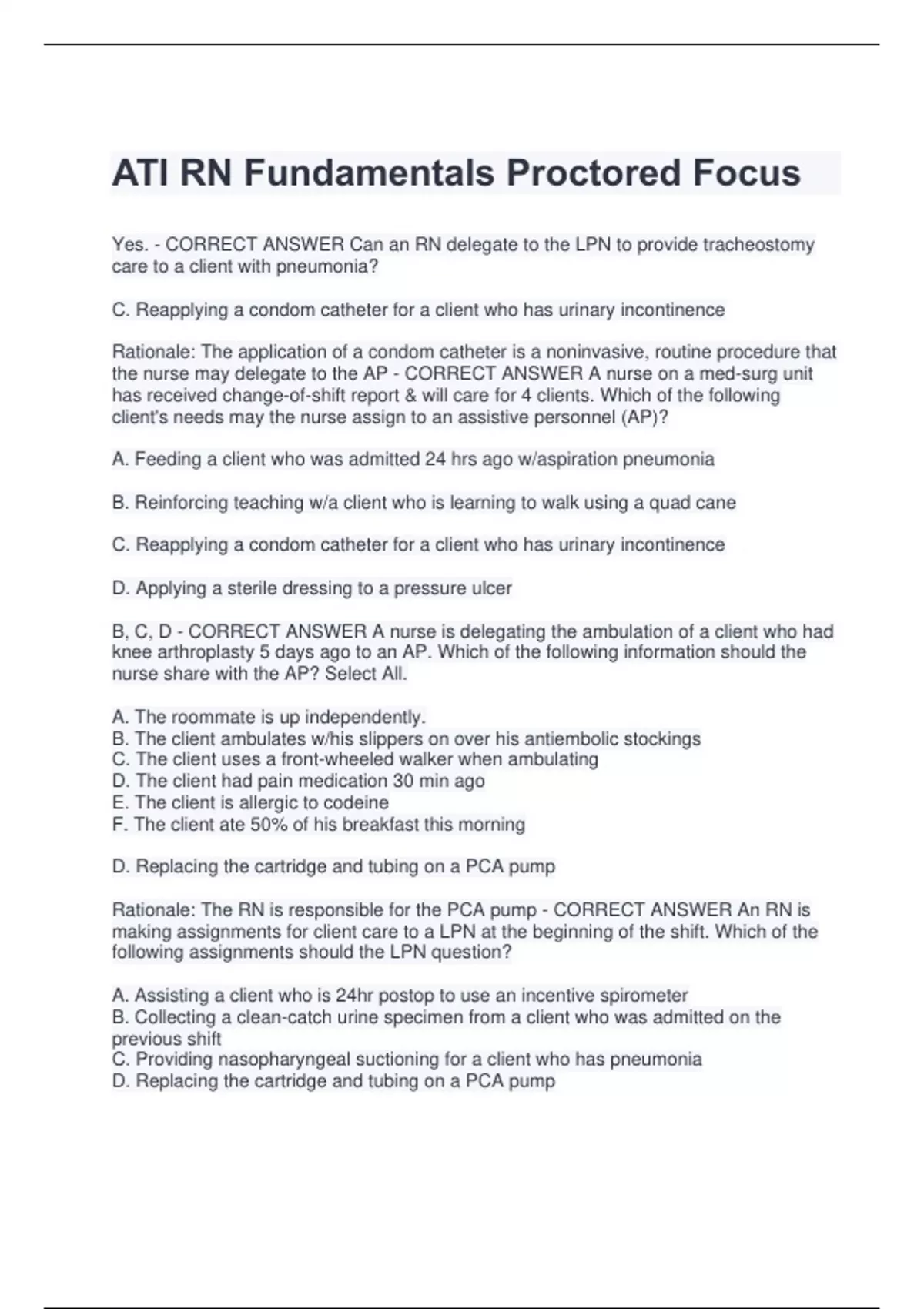 ATI RN Fundamentals Proctored Focus Yes. - CORRECT ANSWER Can an RN delegate to the LPN to provide tracheostomy care to a client with pneumonia? C. Reapplying a condom catheter for a client who has urinary incontinence Rationale: The application of a condom catheter is a noninvasive, routine procedure that the nurse may delegate to the AP - CORRECT ANSWER A nurse on a med-surg unit has received change-of-shift report & will care for 4 clients. Which of the following client's needs may the nurse assign to an assistive personnel (AP)? A. Feeding a client who was admitted 24 hrs ago w/aspiration pneumonia B. Reinforcing teaching w/a client who is learning to walk using a quad cane C. Reapplying a condom catheter for a client who has urinary incontinence D. Applying a sterile dressing to a pressure ulcer B, C, D - CORRECT ANSWER A nurse is delegating the ambulation of a client who had knee arthroplasty 5 days ago to an AP. Which of the following information should the nurse share with the AP? Select All. A. The roommate is up independently. B. The client ambulates w/his slippers on over his antiembolic stockings C. The client uses a front-wheeled walker when ambulating D. The client had pain medication 30 min ago E. The client is allergic to codeine F. The client ate 50% of his breakfast this morning D. Replacing the cartridge and tubing on a PCA pump Rationale: The RN is responsible for the PCA pump - CORRECT ANSWER An RN is making assignments for client care to a LPN at the beginning of the shift. Which of the following assignments should the LPN question? A. Assisting a client who is 24hr postop to use an incentive spirometer B. Collecting a clean-catch urine specimen from a client who was admitted on the previous shift C. Providing nasopharyngeal suctioning for a client who has pneumonia D. Replacing the cartridge and tubing on a PCA pump B, C, E A and D are rights of medication administration - CORRECT ANSWER A nurse is preparing an in-service program about delegation. Which of the following elements should she identify when presenting the 5 rights of delegation? Select all. A. Right client B. Right supervision/evaluation C. Right direction/communication D. Right time E. Right circumstances B. RN A client returning from surgery requires assessment and establishment of a plan of care. RNs are responsible for this, especially if the client is potentially unstable. - CORRECT ANSWER A nurse manager of a med-surg unit is assigning care responsibilities for the oncoming shift. A client is awaiting transfer back to the unit from the PACU following thoracic surgery. To which staff member should the nurse assign to this client? A. Charge nurse B. RN C. LPN D. AP A. Assault By threatening the client, the AP is committing assault. - CORRECT ANSWER A nurse observes an AP reprimanding a client for not using the urinal properly. The AP tells him she will put a diaper on him if he does not use the urinal more carefully next time. Which of the following torts is the AP committing? A. Assault B. Battery C. False imprisonment D. Invasion of privacy B. False imprisonment The nurse gave the med as a chemical restraint to keep the client from leaving the facility against medical advice. The client did not consent. - CORRECT ANSWER An adult client who is competent tells the nurse that he is thinking about leaving the hospital against medical advice. The nurse believes that this is not in the client's best interest, so she administers a PRN sedative med that the client has not requested along w/his usual meds. Which of the following tort has the nurse committed? A. Assault B. False imprisonment C. Negligence D. Breach of confidentiality C. The client has the right to decide and specify which