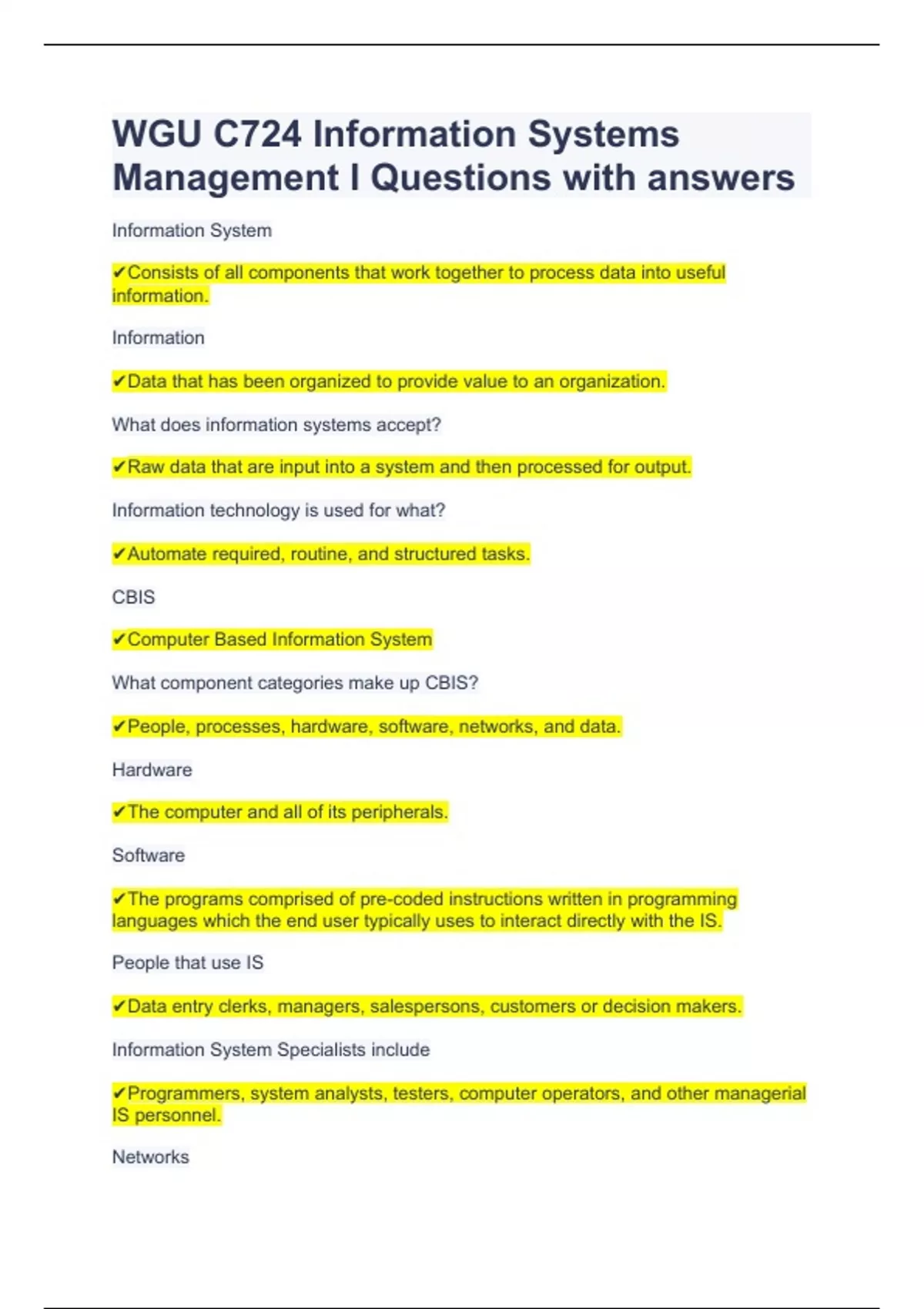 WGU C724 Information Systems Management I Questions with answers