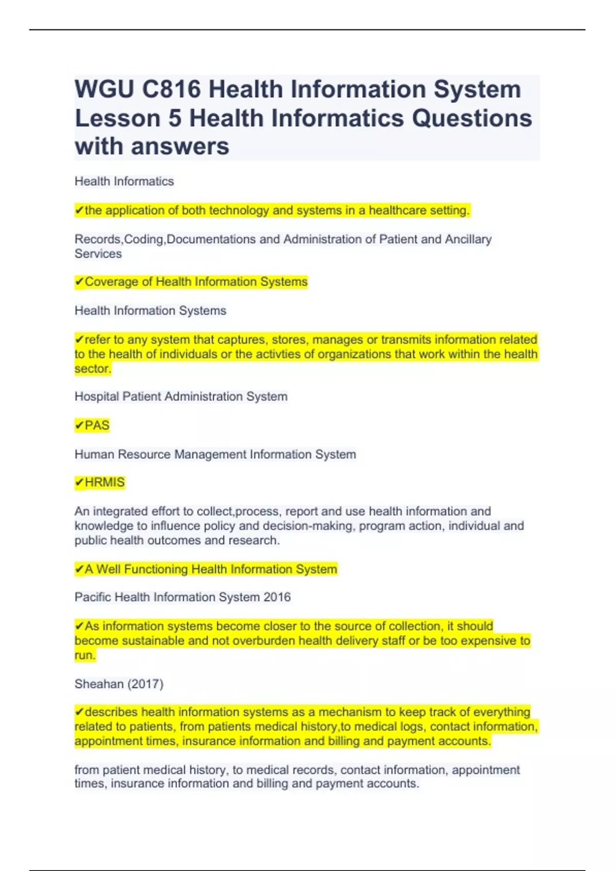 WGU C816 Health Information System Lesson 5 Health Informatics Questions with answers