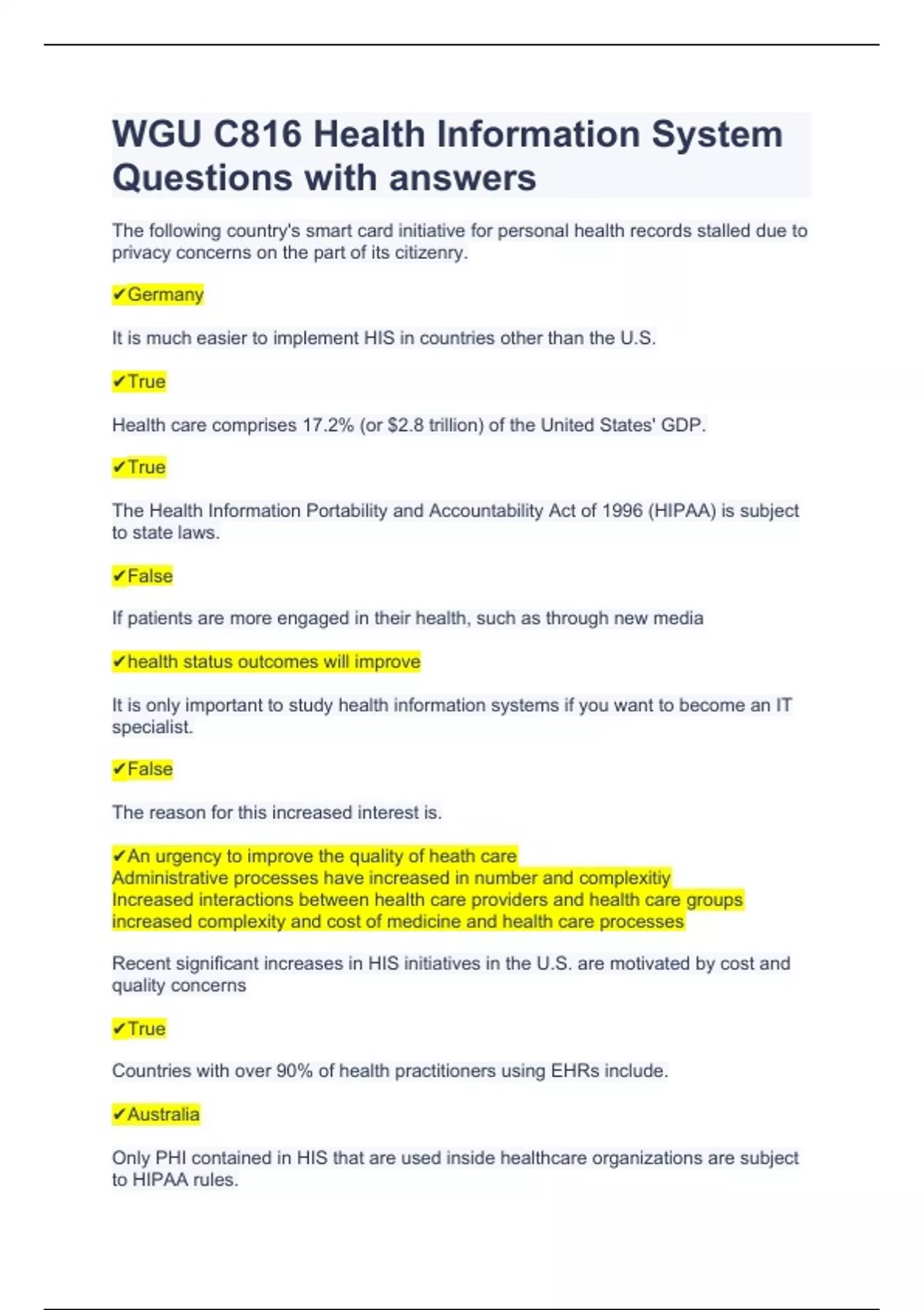 WGU C816 Health Information System Questions with answers