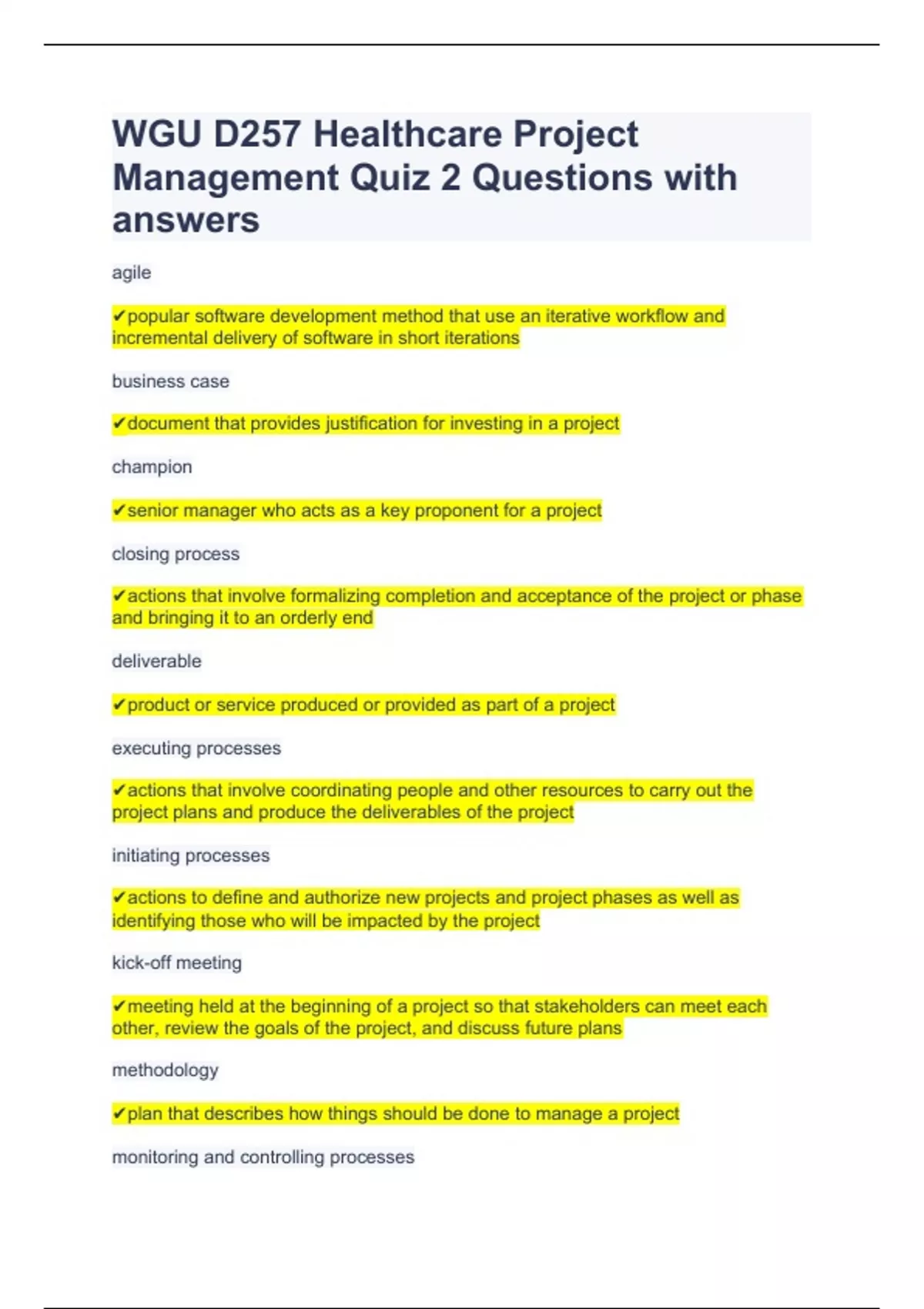 WGU D257 Healthcare Project Management Quiz 2 Questions with answers