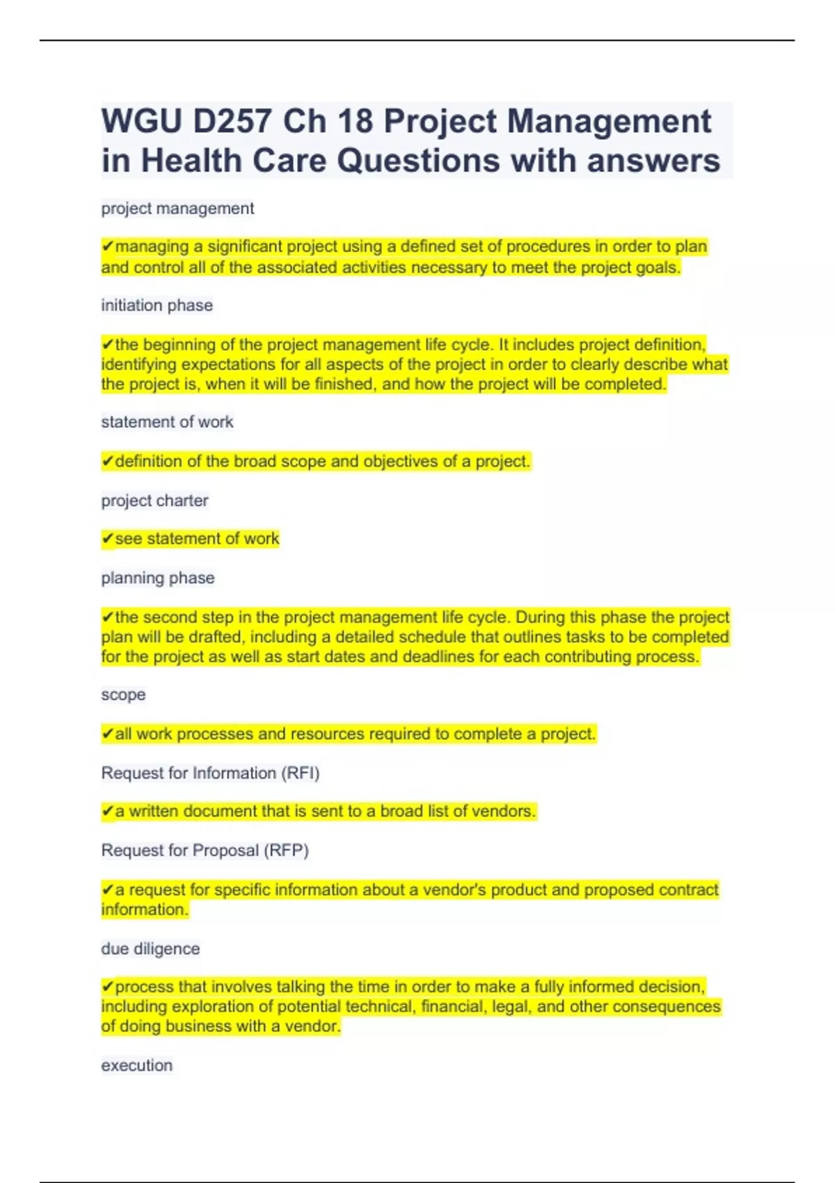 WGU D257 Ch 18 Project Management in Health Care Questions with answers