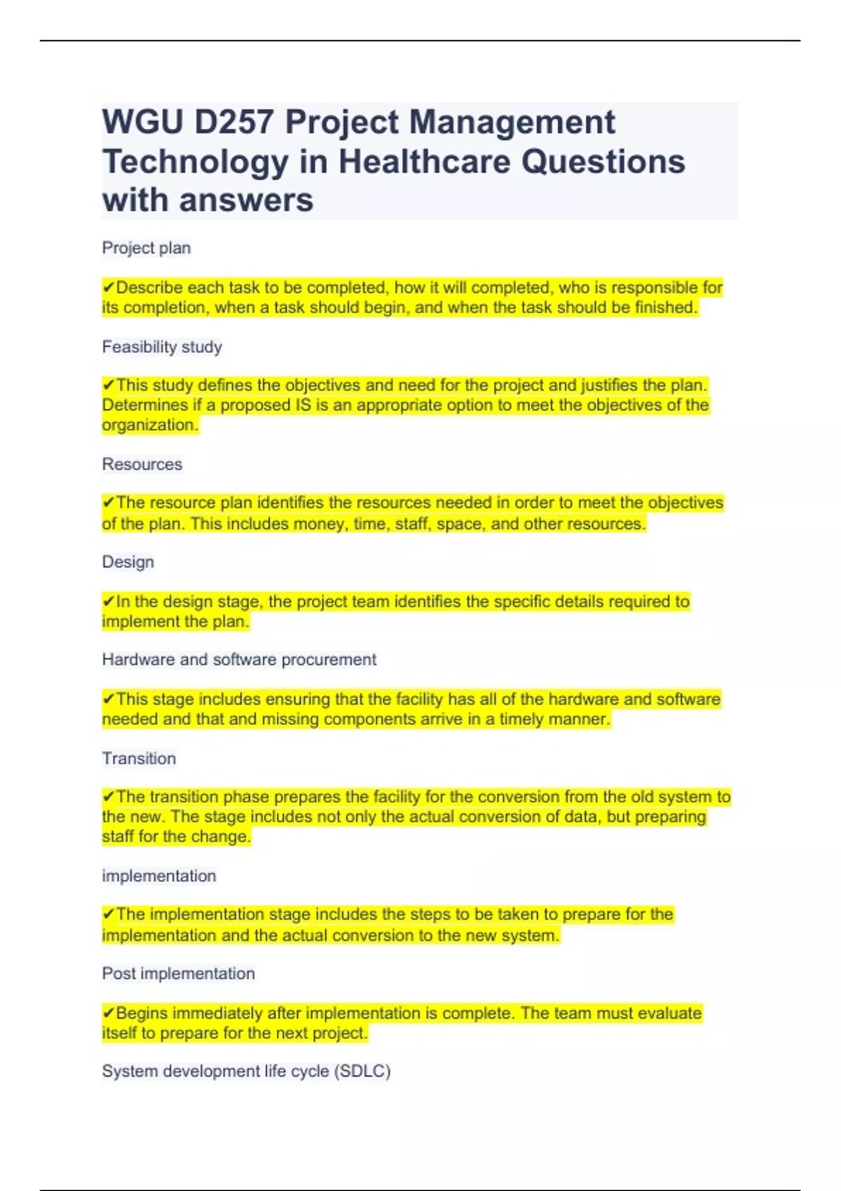 WGU D257 Project Management Technology in Healthcare Questions with answers