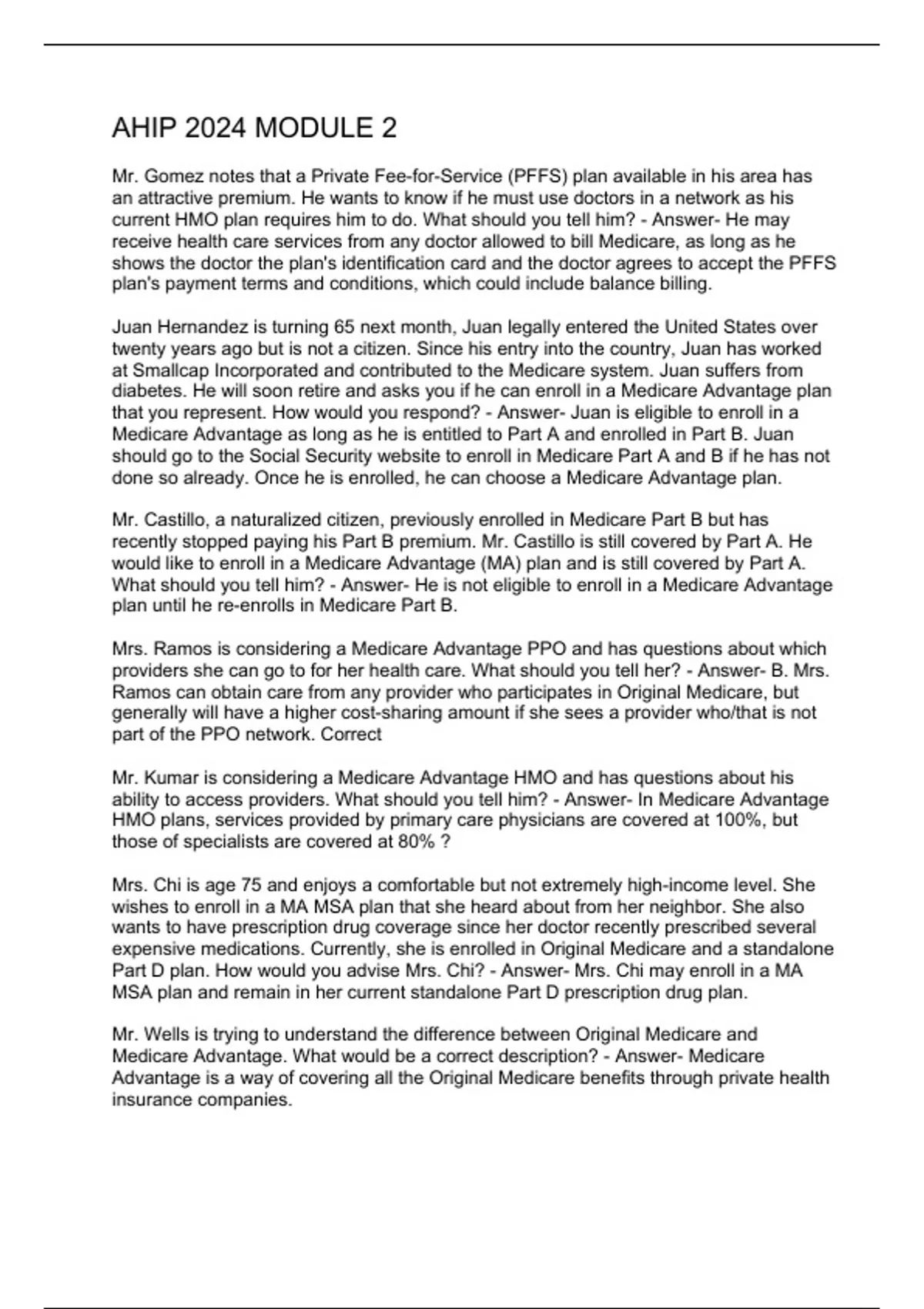 Mr. Gomez notes that a Private Fee-for-Service (PFFS) plan available in his area has an attractive premium. He wants to know if he must use doctors in a network as his current HMO plan requires him to do. What should you tell him? - Answer- He may receive health care services from any doctor allowed to bill Medicare, as long as he shows the doctor the plan's identification card and the doctor agrees to accept the PFFS plan's payment terms and conditions, which could include balance billing. Juan Hernandez is turning 65 next month, Juan legally entered the United States over twenty years ago but is not a citizen. Since his entry into the country, Juan has worked at Smallcap Incorporated and contributed to the Medicare system. Juan suffers from diabetes. He will soon retire and asks you if he can enroll in a Medicare Advantage plan that you represent. How would you respond? - Answer- Juan is eligible to enroll in a Medicare Advantage as long as he is entitled to Part A and enrolled in Part B. Juan should go to the Social Security website to enroll in Medicare Part A and B if he has not done so already. Once he is enrolled, he can choose a Medicare Advantage plan. Mr. Castillo, a naturalized citizen, previously enrolled in Medicare Part B but has recently stopped paying his Part B premium. Mr. Castillo is still covered by Part A. He would like to enroll in a Medicare Advantage (MA) plan and is still covered by Part A. What should you tell him? - Answer- He is not eligible to enroll in a Medicare Advantage plan until he re-enrolls in Medicare Part B. Mrs. Ramos is considering a Medicare Advantage PPO and has questions about which providers she can go to for her health care. What should you tell her? - Answer- B. Mrs. Ramos can obtain care from any provider who participates in Original Medicare, but generally will have a higher cost-sharing amount if she sees a provider who/that is not part of the PPO network. Correct Mr. Kumar is considering a Medicare Advantage HMO and has questions about his ability to access providers. What should you tell him? - Answer- In Medicare Advantage HMO plans, services provided by primary care physicians are covered at 100%, but those of specialists are covered at 80% ? Mrs. Chi is age 75 and enjoys a comfortable but not extremely high-income level. She wishes to enroll in a MA MSA plan that she heard about from her neighbor. She also wants to have prescription drug coverage since her doctor recently prescribed several expensive medications. Currently, she is enrolled in Original Medicare and a standalone Part D plan. How would you advise Mrs. Chi? - Answer- Mrs. Chi may enroll in a MA MSA plan and remain in her current standalone Part D prescription drug plan. Mr. Wells is trying to understand the difference between Original Medicare and Me