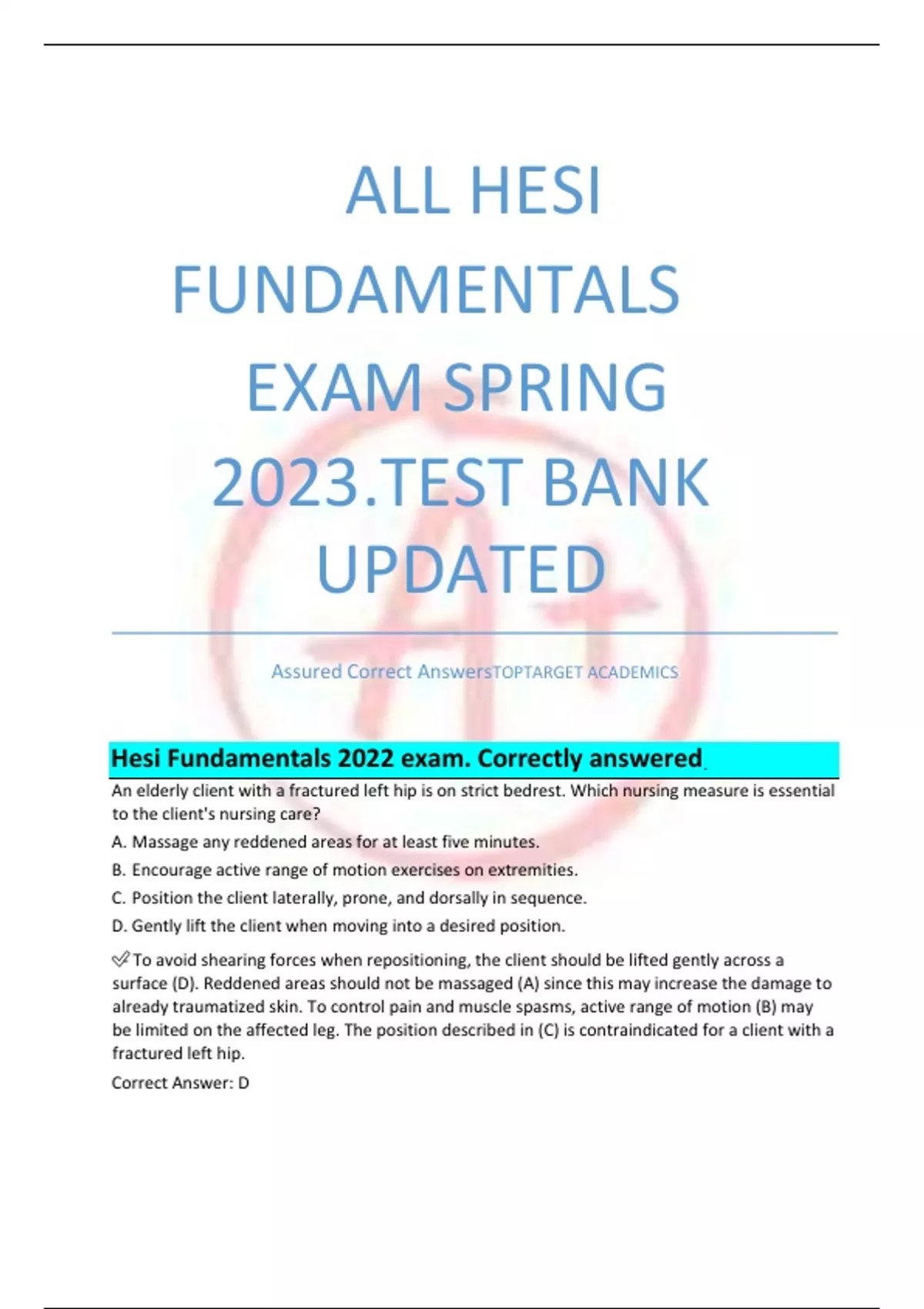 ALL HESI FUNDAMENTALS EXAM SPRING 2023.TEST BANK UPDATED Assured Correct AnswersTOPTARGET ACADEMICS Hesi Fundamentals 2022 exam. Correctly answered. An elderly client with a fractured left hip is on strict bedrest. Which nursing measure is essential to the client's nursing care? A. Massage any reddened areas for at least five minutes. B. Encourage active range of motion exercises on extremities. C. Position the client laterally, prone, and dorsally in sequence. D. Gently lift the client when moving into a desired position. - To avoid shearing forces when repositioning, the client should be lifted gently across a surface (D). Reddened areas should not be massaged (A) since this may increase the damage to already traumatized skin. To control pain and muscle spasms, active range of motion (B) may be limited on the affected leg. The position described in (C) is contraindicated for a client with a fractured left hip. Correct Answer: D The nurse is administering medications through a nasogastric tube (NGT) which is connected to suction. After ensuring correct tube placement, what action should the nurse take next? A. Clamp the tube for 20 minutes. B. Flush the tube with water. C. Administer the medications as prescribed. D. Crush the tablets and dissolve in sterile water. - The NGT should be flushed before, after and in between each medication administered (B). Once all medications are administered, the NGT should be clamped for 20 minutes (A). (C and D) may be implemented only after the tubing has been flushed. Correct Answer: B A client who is in hospice care complains of increasing amounts of pain. The healthcare provider prescribes an analgesic every four hours as needed. Which action should the nurse implement? A. Give an around-the-clock schedule for administration of analgesics. B. Administer analgesic medication as needed when the pain is severe. C. Provide medication to keep the client sedated and unaware of stimuli. D. Offer a medication-free period so that the client can do daily activities. - The most effective management of pain is achieved using an around-the-clock schedule that provides analgesic medications on a regular basis (A) and in a timely manner. Analgesics are less effective if pain persists until it is severe, so an analgesic medication should be administered before the client's pain peaks (B). Providing comfort is a priority for the client who is dying, but sedation that impairs the client's ability to interact and experience the time before life ends should be minimized (C). Offering a medication-free period allows the serum drug level to fall, which is not an effective method to manage chronic pain (D). Correct Answer: A When assessing a client with wrist restraints, the nurse observes that the fingers on the right hand are blue. What action should the nurse implement first? A. Loosen the right wrist restraint. B. Apply a pulse oximeter to the right hand. C. Compare hand color bilaterally. D. Palpate the right radial pulse. - The priority nursing action is to restore circulation by loosening the restraint (A), because blue fingers (cyanosis) indicates decreased circulation. (C and D) are also important nursing interventions, but do not have the priority of (A). Pulse oximetry (B) measures the saturation of hemoglobin with oxygen and is not indicated in situations where the cyanosis is related to mechanical compression (the restraints). Correct Answer: A The nurse is assessing the nutritional status of several clients. Which client has the greatest nutritional need for additional intake of protein? A. A college-age track runner with a sprained ankle. B. A lactating woman nursing her 3-day-old infant. C. A school-aged child with Type 2 diabetes. D. An elderly man being treated for a peptic ulcer. - A lactating woman (B) has the greatest need for additional protein intake. (A, C, and D) are all conditions that require protein, but do not have the increased metabolic protein demands of lactation. Correct Answer: B A client is in the radiology department at 0900 when the prescription levofloxacin (Levaquin) 500 mg IV q24h is scheduled to be administered. The client returns to the unit at 1300. What is the best intervention for the nurse to implement? A. Contact the healthcare provider and complete a medication variance form. B. Administer the Levaquin at 1300 and resume the 0900 schedule in the morning. C. Notify the charge nurse and complete an incident report to explain the missed dose. D. Give the missed dose at 1300 and change the schedule to administer daily at 1300. - To ensure that a therapeutic level of medication is maintained, the nurse should administer the missed dose as soon as possible, and revise the administration schedule accordingly to prevent dangerously increasing the level of the medication in the bloodstream (D). The nurse should document the reason for the late dose, but (A and C) are not warranted. (B) could result in increased blood levels of the drug. Correct Answer: D While instructing a male client's wife in the performance of passive range-of-motion exercises to his contracted shoulder, the nurse observes that she is holding his arm above and below the elbow. What nursing action should the nurse implement? A. Acknowledge that she is supporting the arm correctly. B. Encourage her to keep the joint covered to maintain warmth. C. Reinforce the need to grip directly under the joint for better support. D. Instruct her to grip directly over the joint for better motion. - The wife is performing the passive ROM correctly, therefore the nurse should acknowledge this fact (A). The joint that is being exercised should be uncovered (B) while the rest of the body should remain covered for warmth and privacy. (C and D) do not provide adequate support to the joint while still allowing for joint movement. Correct Answer: A What is the most important reason for starting intravenous infusions in the upper extremities rather than the lower extremities of adults