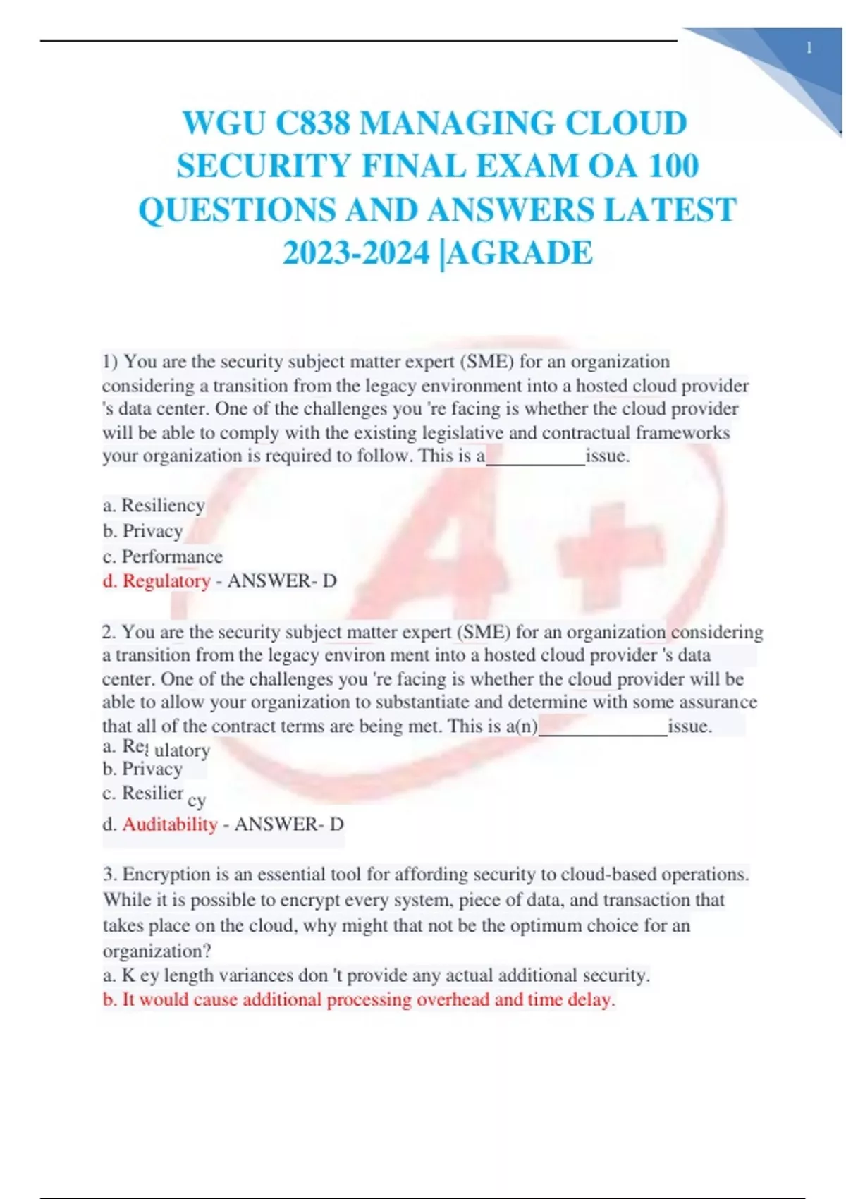 WGU C838 MANAGING CLOUD SECURITY FINAL EXAM OA 100 QUESTIONS AND ANSWERS LATEST |AGRADE