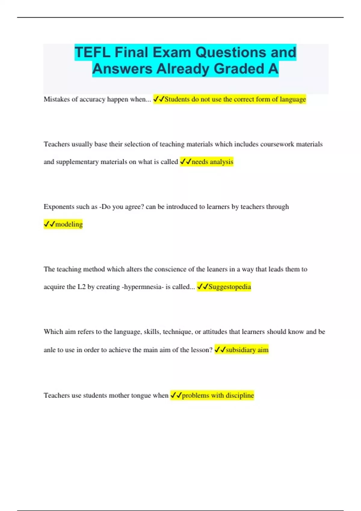 TEFL Final Exam Questions and Answers Already Graded A
