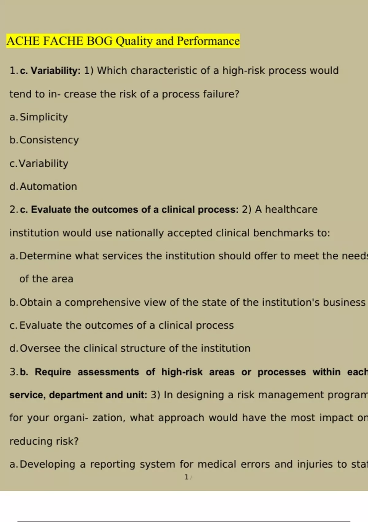 ACHE FACHE BOG Quality and Performance Latest 2023/2024[100% correct answers & explanations]