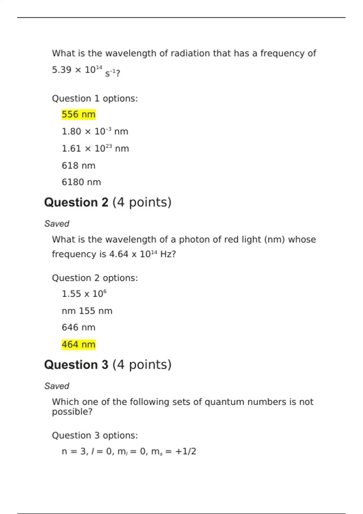 1. Question: What is the wavelength of radiation that has a frequency of 5.39 × 1014 s–1? 2. Question: What is the wavelength of a photon of red light (nm) whose frequency is 4.64 x 1014 Hz? 3. Question: Which one of the following sets of quantum numbers is not possible? 4. Question: In Bohr's atomic theory, when an electron moves from one energy level to another energy level more distant from the nucleus: 5. Question: Calculate the wavelength of a neutron that has a velocity of 250 cm/s. 6. Question: Which one of the following sets of quantum numbers represents an electron with the highest energy? 7. Question: Order the elements S, Cal, and F in terms of increasing ionization energy. 8. Question: For an electron in a given atom, the larger n, the 9. Question: Calculate the energy, in joules, required to excite a hydrogen atom by causing an electronic transition from the n = 1 to the n = 4 principal energy level. 10. Question: Which orbitals do not have a node at the nucleus? 11. Question: How many electrons can a single orbital hold? 12. Question: For an orbital, a node is 13. Question: What are the possible values of l if n = 4? 14. Question: Which element has the highest first electron affinity? 15. Question: What is the energy of a photon of electromagnetic radiation with a wavelength of 665 nm appears as orange light to the human eye? 16. Question: Describe the shape of one of the d orbitals. 17. Question: For a hydrogen atom, which electronic transition would result in the emission of a photon with the highest energy? 18. Question: What is the de Broglie wavelength (m) of an electron with a velocity of 8.20 × 106 m/s. (The mass of the electron is 9.11 × 10-28 g.) 19. Question: Place the following in order of increasing radius: 20. Question: Which of the following transitions (in a hydrogen atom) represent emission of the longest wavelength photon? 21. Question: Of the following, which element has the highest first ionization energy? 22. Question: Write the complete electron configuration of germanium, element 32. 23. Question: In which orbital below would an electron (on average) be closest to the nucleus? 24. Question: What is the ground state electron configuration for Zr2+? 25. Question: What is the frequency of electromagnetic radiation with a wavelength of 445 nm appears as blue light to the human eye?