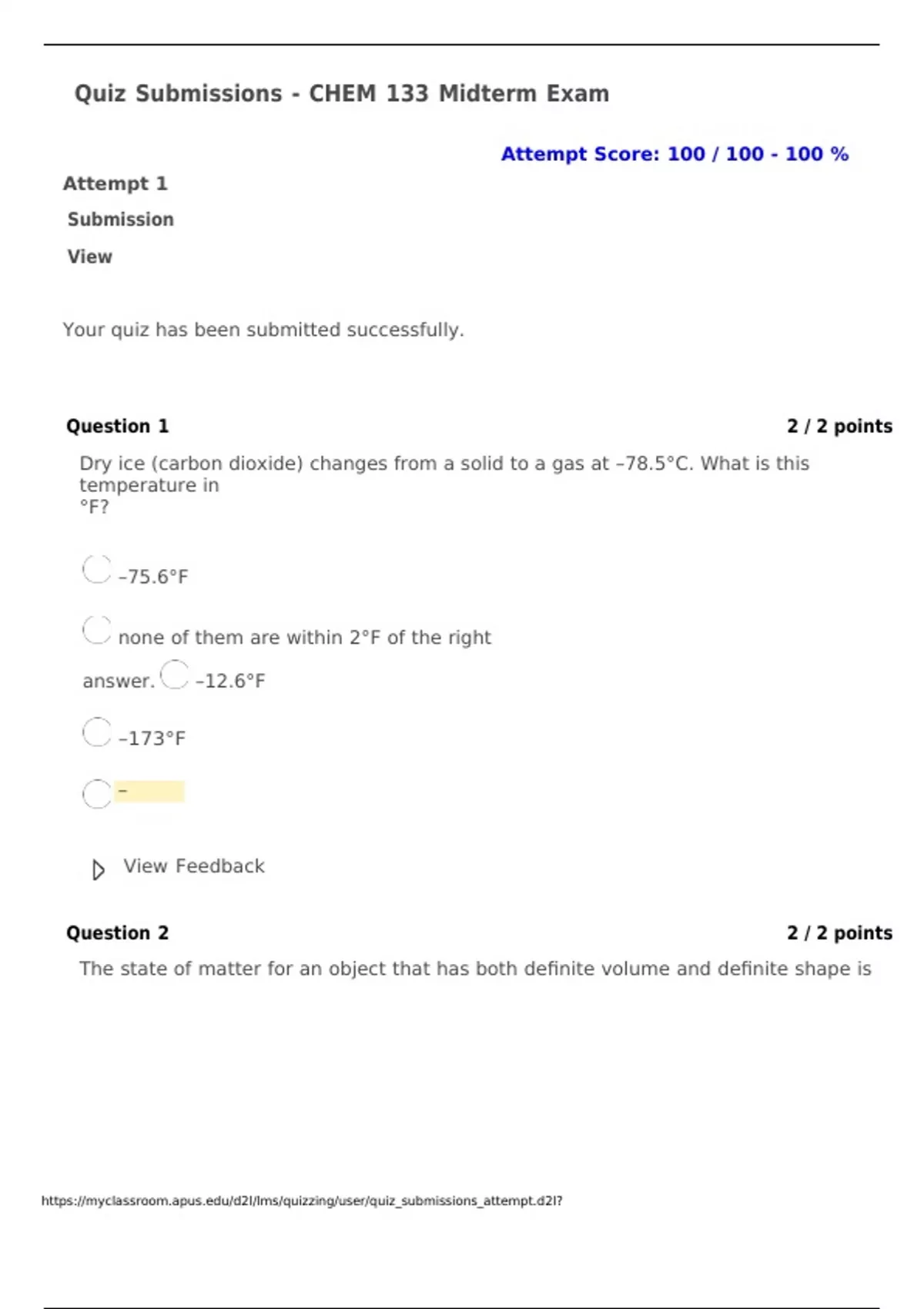 CHEM133 Week 7 Midterm Exam: 100% Score