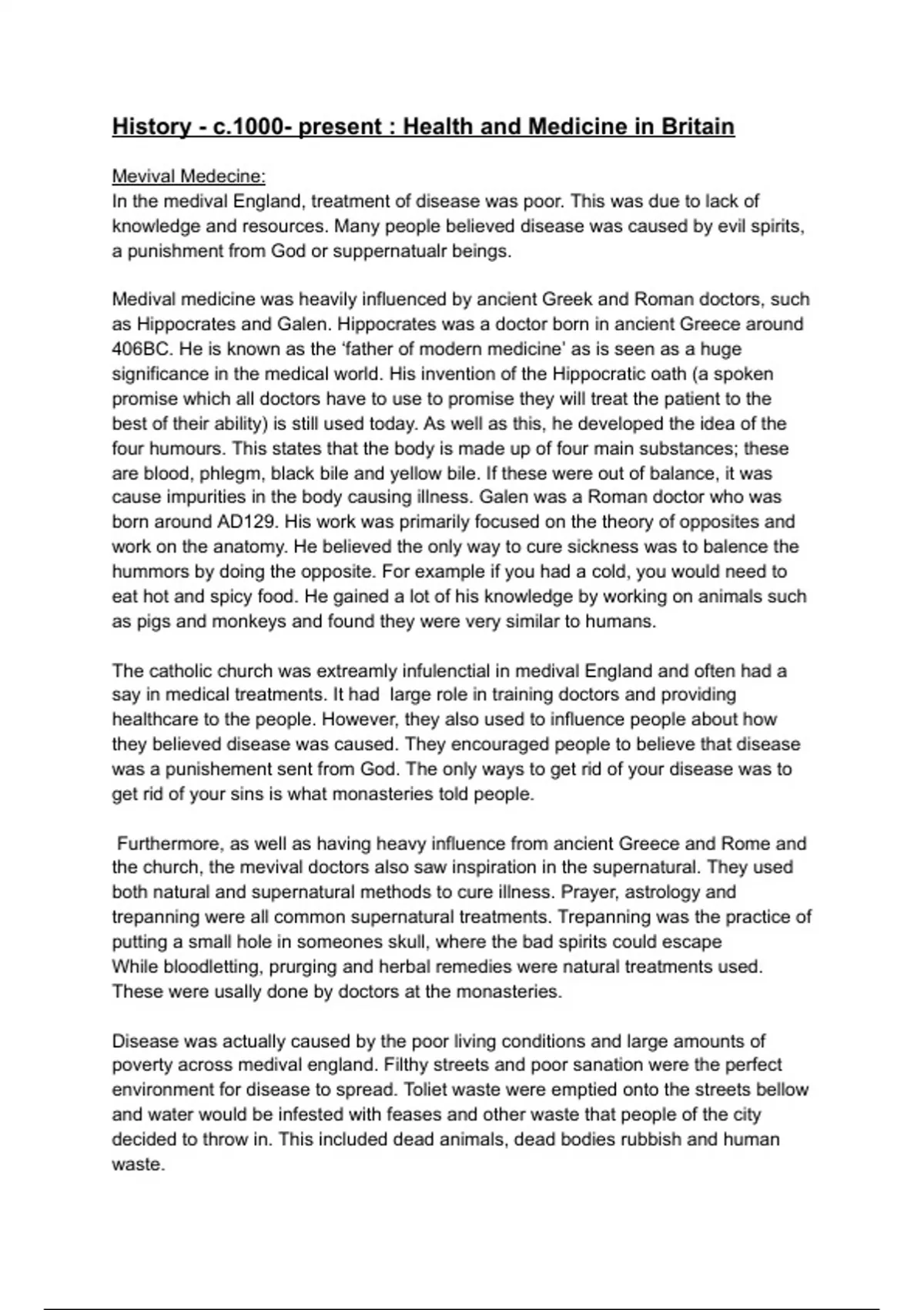 This is four pages worth of very in detailed history c.1000-present Health, Medicine and the people notes from a former GCSE AQA student