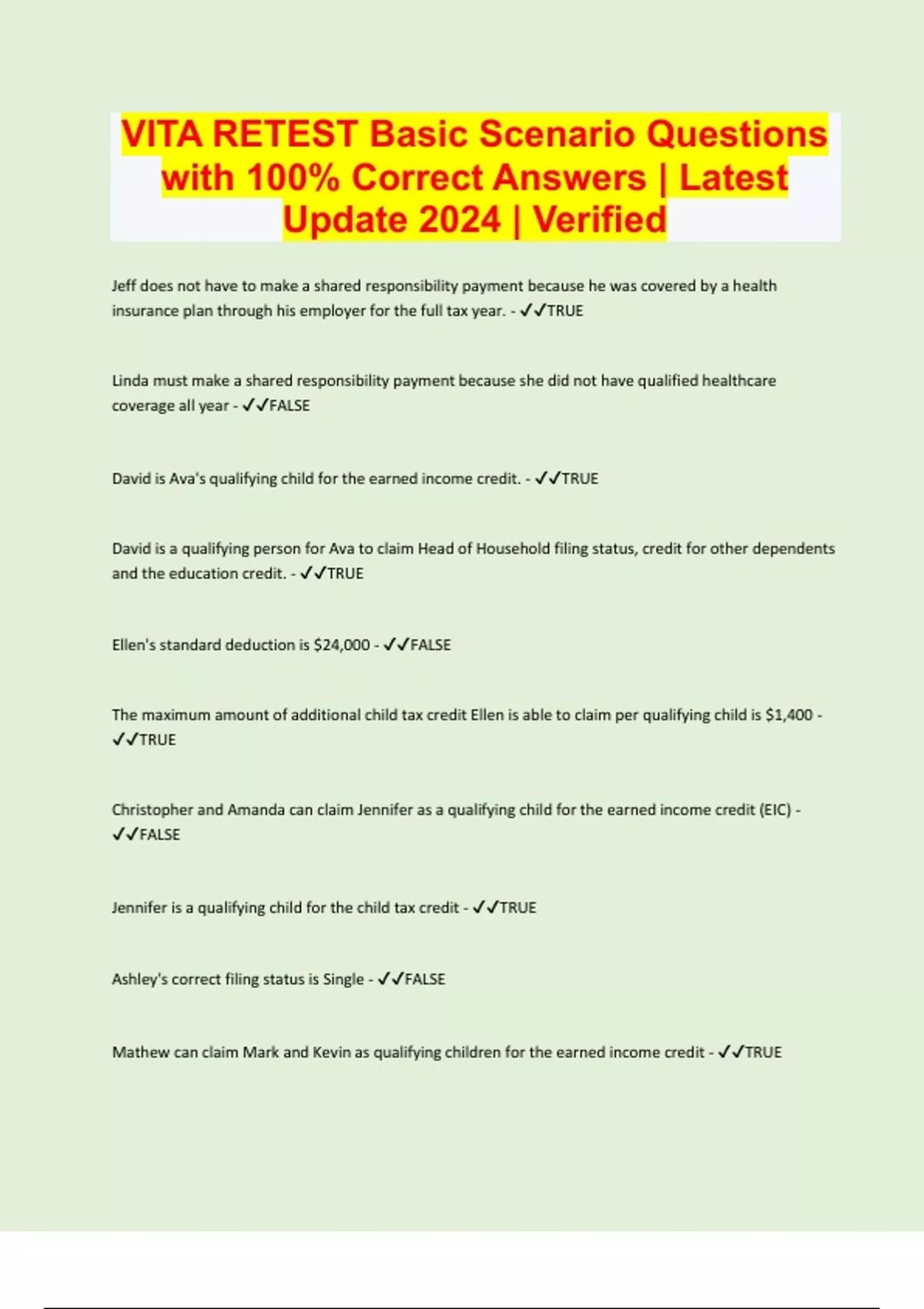 VITA RETEST Basic Scenario Questions with 100% Correct Answers | Latest Update 2024 | Verified