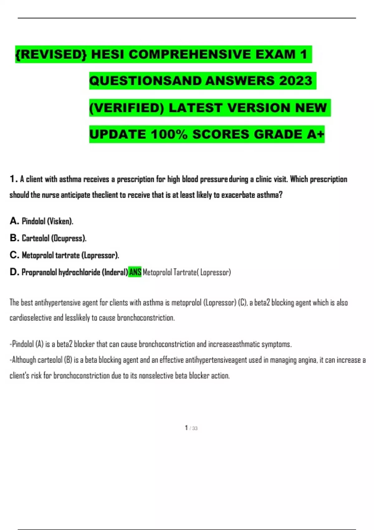 {REVISED} HESI COMPREHENSIVE EXAM 1 QUESTIONS AND ANSWERS 2023 (VERIFIED) LATEST VERSION NEW UPDATE 100% SCORES GRADE A+ 1. A client with asthma receives a prescription for high blood pressure during a clinic visit. Which prescription should the nurse anticipate the client to receive that is at least likely to exacerbate asthma? A. Pindolol (Visken). B. Carteolol (Ocupress). C. Metoprolol tartrate (Lopressor). D. Propranolol hydrochloride (Inderal) ANS Metoprolol Tartrate( Lopressor) The best antihypertensive agent for clients with asthma is metoprolol (Lopressor) (C), a beta2 blocking agent which is also cardioselective and less likely to cause bronchoconstriction. -Pindolol (A) is a beta2 blocker that can cause bronchoconstriction and increase asthmatic symptoms. -Although carteolol (B) is a beta blocking agent and an effective antihypertensive agent used in managing angina, it can increase a client's risk for bronchoconstriction due to its nonselective beta blocker action. -Propranolol (D) also blocks the beta2 receptors in the lungs, causing bronchocon- striction, and is not indicated in clients with asthma and other obstructive pulmonary disorders. 2. A male client who has been taking propranolol ( inderal) for 18 months tells the nurse the healthcare provider discontinued the medication because his blood pressure has been normal for the past three months. Which instruction should the use provide ANS Ask the health care provider about tapering the drug dose over the next week. Although the healthcare provider discontinued the propranolol, measures to prevent rebound cardiac excitation, such as progressively reducing the dose over one to two weeks (C), should be recommended to prevent rebound tachycardia, hypertension, and ventricular dysrhythmias. Abrupt cessation (A and B) of the beta-blocking agent may precipitate tachycardia and rebound hypertension, so gradual weaning should be recommended. 3. A client who is taking clonidine ( Catapres, Duraclon) reports drowsiness. Which additional assessment should the nurse make ANS How long has the client been taking the medication Drowsiness can occur in the early weeks of treatment with clonidine and with continued use becomes less intense, so the length of time the client has been on