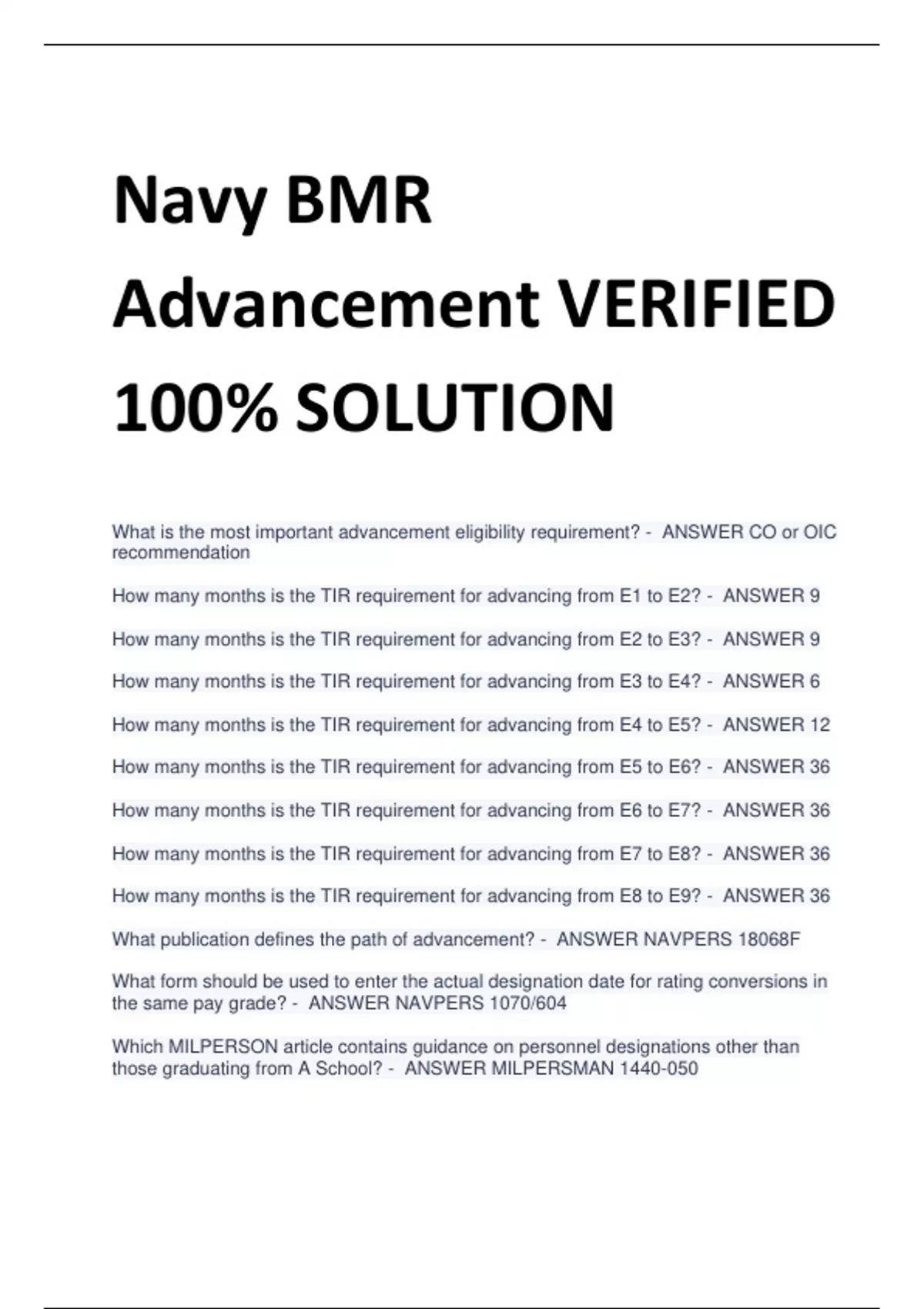 Navy BMR Advancement VERIFIED 100% SOLUTION What is the most important advancement eligibility requirement? - ANSWER CO or OIC recommendation How many months is the TIR requirement for advancing from E1 to E2? - ANSWER 9 How many months is the TIR requirement for advancing from E2 to E3? - ANSWER 9 How many months is the TIR requirement for advancing from E3 to E4? - ANSWER 6 How many months is the TIR requirement for advancing from E4 to E5? - ANSWER 12 How many months is the TIR requirement for advancing from E5 to E6? - ANSWER 36 How many months is the TIR requirement for advancing from E6 to E7? - ANSWER 36 How many months is the TIR requirement for advancing from E7 to E8? - ANSWER 36 How many months is the TIR requirement for advancing from E8 to E9? - ANSWER 36 What publication defines the path of advancement? - ANSWER NAVPERS 18068F What form should be used to enter the actual designation date for rating conversions in the same pay grade? - ANSWER NAVPERS 1070/604 Which MILPERSON article contains guidance on personnel designations other than those graduating from A School? - ANSWER MILPERSMAN 1440-05