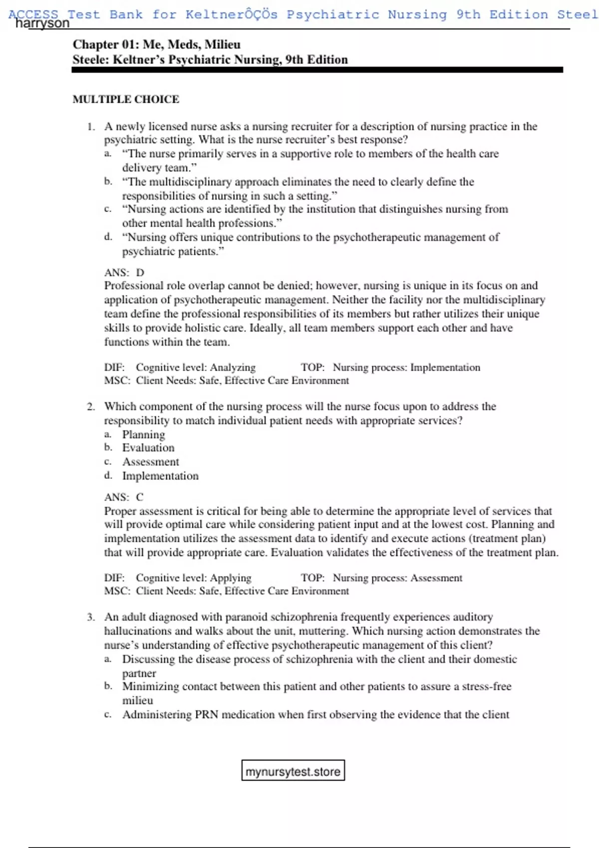 Steele: Keltner’s Psychiatric Nursing, 9th Edition Chapter 01: Me, Meds, Milieu Steele: Keltner’s Psychiatric Nursing, 9th Edition MULTIPLE CHOICE 1. A newly licensed nurse asks a nursing recruiter for a description of nursing practice in the psychiatric setting. What is the nurse recruiter’s best response? a. “The nurse primarily serves in a supportive role to members of the health care delivery team.” b. “The multidisciplinary approach eliminates the need to clearly define the responsibilities of nursing in such a setting.” c. “Nursing actions are identified by the institution that distinguishes nursing from other mental health professions.” d. “Nursing offers unique contributions to the psychotherapeutic management of psychiatric patients.” ANS: D Professional role overlap cannot be denied; however, nursing is unique in its focus on and application of psychotherapeutic management. Neither the facility nor the multidisciplinary team define the professional responsibilities of its members but rather utilizes their unique skills to provide holistic care. Ideally, all team members support each other and have functions within the team. DIF: Cognitive level: Analyzing TOP: Nursing process: Implementation MSC: Client Needs: Safe, Effective Care Environment 2. Which component of the nursing process will the nurse focus upon to address the responsibility to match individual patient needs with appropriate services? a. Planning b. Evaluation c. Assessment d. Implementation ANS: C Proper assessment is critical for being able to determine the appropriate level of services that will provide optimal care while considering patient input and at the lowest cost. Planning and implementation utilizes the assessment data to identify and execute actions (treatment plan) that will provide appropriate care. Evaluation validates the effectiveness of the treatment plan. DIF: Cognitive level: Applying TOP: Nursing process: Assessment MSC: Client Needs: Safe, Effective Care Environment 3. An adult diagnosed with paranoid schizophrenia frequently experiences auditory hallucinations and walks about the unit, muttering. Which nursing action demonstrates the nurse’s understanding of effective psychotherapeutic management of this client? a. Discussing the disease process of schizophrenia with the client and their domestic partner b. Minimizing contact between this patient and other patients to assure a stress-free milieu c. Administering PRN medication when first observing the evidence that the client ACCESS Test Bank for KeltnerÔÇÖs Psychiatric Nursing 9th Edition Steele harryson may be hallucinating d. Independently determining that behavior modification is appropriate to decrease the client’s paranoid thoughts ANS: A An understanding of psychopathology is the foundation on which the three components of psychotherapeutic management rest; it facilitates therapeutic communication and provides a basis for understanding psychopharmacology and milieu management. Minimizing contact between the patient and others and administering PRN medication indiscriminately are nontherapeutic interventions. Using behavior modification to decrease the frequency of hallucinations would need to be incorporated into the plan of care by the care team. DIF: Cognitive level: Applying TOP: Nursing process: Implementation MSC: Client Needs: Safe, Effective Care Environment 4. An adult diagnosed with chronic depression is hospitalized after a suicide attempt. Which intervention is critical in assuring long-term, effective client care as described by psychotherapeutic management? a. Involvement in group therapies b. Focus of close supervision by the unit staff c. Maintaining effective communication with support system d. Frequently scheduled one-on-one time with nursing staff ANS: D A critical element of psychotherapeutic management is the presence of a therapeutic nurse-patient relationship. One-on-one time with nursing staff will help in establishing this connection. While the other options are appropriate and client centered, the nurse-client relation is critical in the long-term delivery of quality effective care to this client. DIF: Cognitive level: Applying TOP: Nursing process: Implementation MSC: Client Needs: Psychosocial Integrity 5. A patient’s haloperidol dosage was reduced 2 weeks ago to decrease side effects. What assessment question demonstrates the nurse’s understanding of the resulting needs of the client? a. “Will you have any difficulty getting your prescription refilled?” b. “Have you begun experiencing any forms of hallucinations?” c. “What do you expect will occur since the dosage has been reduced?” d. “What can I do to help you manage this reduction in haloperidol therapy?” ANS: B It will be necessary for the nurse to assess for exacerbation of the patient’s symptoms of psychosis as well as for a lessening of side effects. Dosage decrease might lead to the return or worsening of positive symptoms such as hallucinations and delusions, and negative symptoms such as blunted affect, social withdrawal, and poor grooming. While the other options may be appropriate assessment questions, they are not directed at the current needs of the client which is the identification of emerging psychotic behavior