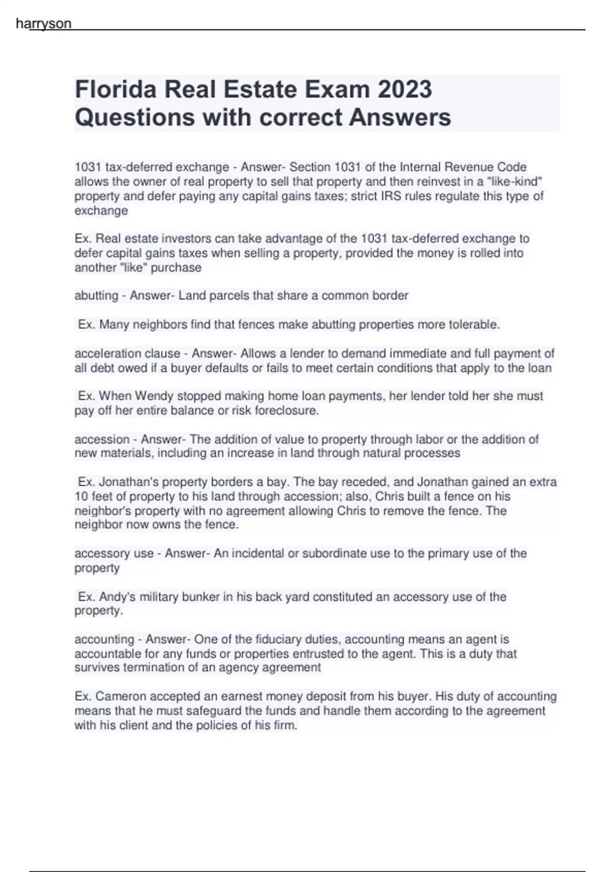 Florida Real Estate Exam Questions 2023 (With 100% Correct Answers)Florida Real Estate Exam 2023 Questions with correct Answers 1031 tax-deferred exchange - Answer- Section 1031 of the Internal Revenue Code allows the owner of real property to sell that property and then reinvest in a "like-kind" property and defer paying any capital gains taxes; strict IRS rules regulate this type of exchange Ex. Real estate investors can take advantage of the 1031 tax-deferred exchange to defer capital gains taxes when selling a property, provided the money is rolled into another "like" purchase abutting - Answer- Land parcels that share a common border Ex. Many neighbors find that fences make abutting properties more tolerable. acceleration clause - Answer- Allows a lender to demand immediate and full payment of all debt owed if a buyer defaults or fails to meet certain conditions that apply to the loan Ex. When Wendy stopped making home loan payments, her lender told her she must pay off her entire balance or risk foreclosure. accession - Answer- The addition of value to property through labor or the addition of new materials, including an increase in land through natural processes Ex. Jonathan's property borders a bay. The bay receded, and Jonathan gained an extra 10 feet of property to his land through accession; also, Chris built a fence on his neighbor's property with no agreement allowing Chris to remove the fence. The neighbor now owns the fence. accessory use - Answer- An incidental or subordinate use to the primary use of the property Ex. Andy's military bunker in his back yard constituted an accessory use of the property. accounting - Answer- One of the fiduciary duties, accounting means an agent is accountable for any funds or properties entrusted to the agent. This is a duty that survives termination of an agency agreement Ex. Cameron accepted an earnest money deposit from his buyer. His duty of accounting means that he must safeguard the funds and handle them according to the agreement with his client and the policies of his firm.