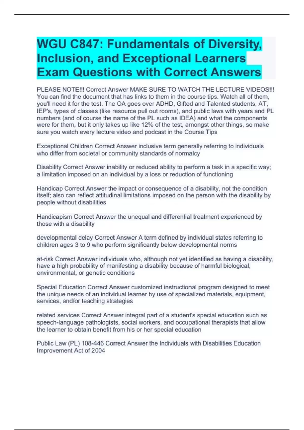PLEASE NOTE!!! Correct Answer MAKE SURE TO WATCH THE LECTURE VIDEOS!!! You can find the document that has links to them in the course tips. Watch all of them, you'll need it for the test. The OA goes over ADHD, Gifted and Talented students, AT, IEP's, types of classes (like resource pull out rooms), and public laws with years and PL numbers (and of course the name of the PL such as IDEA) and what the components were for them, but it only takes up like 12% of the test, amongst other things, so make sure you watch every lecture video and podcast in the Course Tips Exceptional Children Correct Answer inclusive term generally referring to individuals who differ from societal or community standards of normalcy Disability Correct Answer inability or reduced ability to perform a task in a specific way; a limitation imposed on an individual by a loss or reduction of functioning Handicap Correct Answer the impact or consequence of a disability, not the condition itself; also can reflect attitudinal limitations imposed on the person with the disability by people without disabilities Handicapism Correct Answer the unequal and differential treatment experienced by those with a disability developmental delay Correct Answer A term defined by individual states referring to children ages 3 to 9 who perform significantly below developmental norms at-risk Correct Answer individuals who, although not yet identified as having a disability, have a high probability of manifesting a disability because of harmful biological, environmental, or genetic conditions Special Education Correct Answer customized instructional program designed to meet the unique needs of an individual learner by use of specialized materials, equipment, services, and/or teaching strategies related services Correct Answer integral part of a student's special education such as speech-language pathologists, social workers, and occupational therapists that allow the learner to obtain benefit from his or her special education Public Law (PL) 108-446 Correct Answer the Individuals with Disabilities Education Improvement Act of 2004